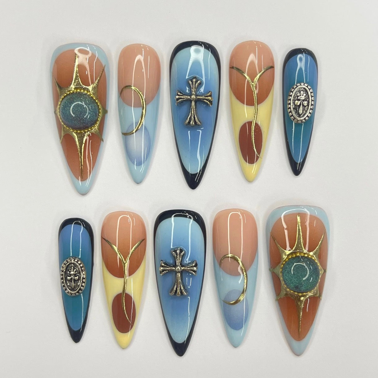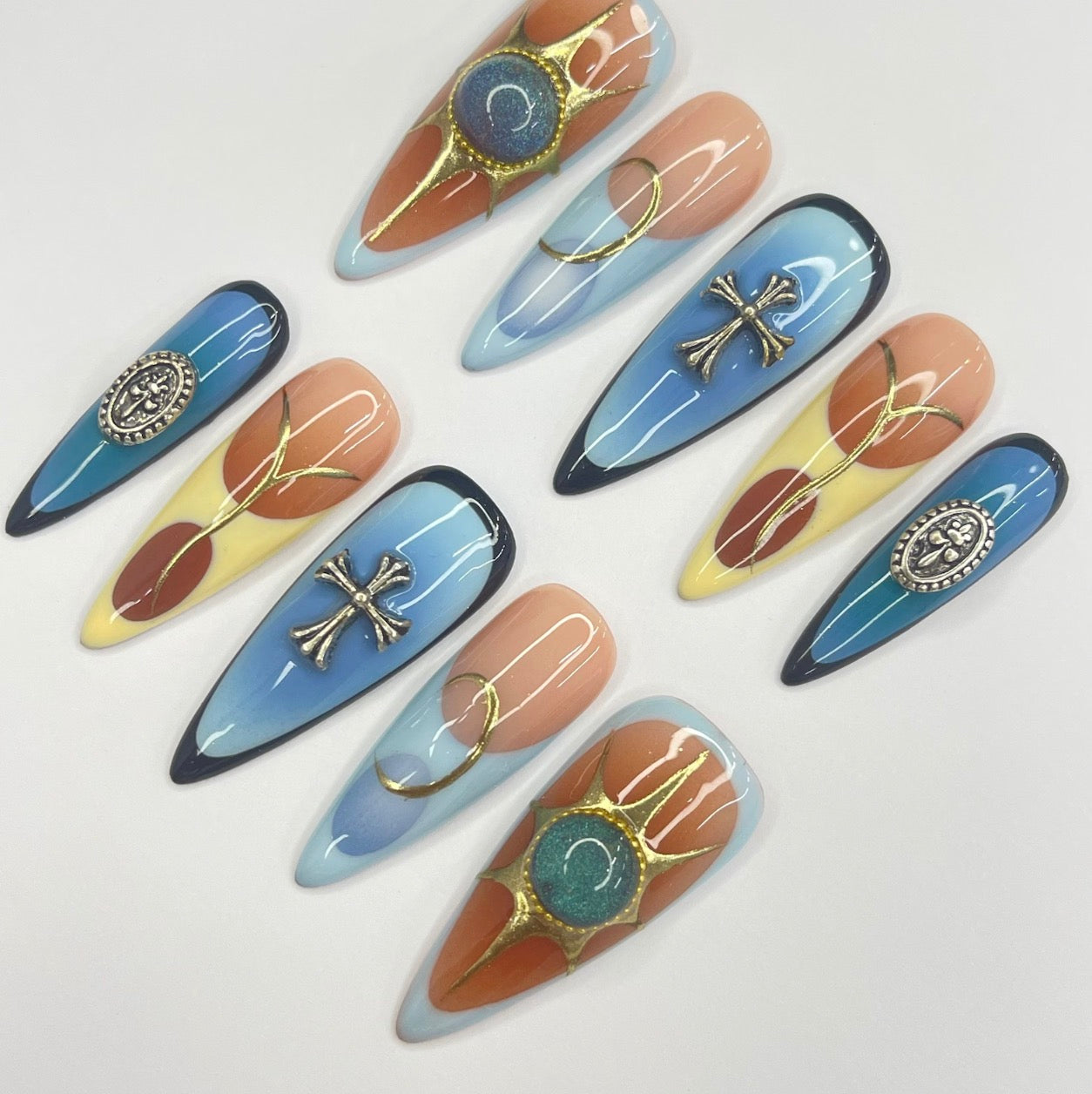 Summer Color Blue & Yellow Aura French Tip Long Almond Press On Nails