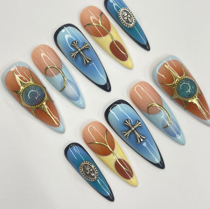 Effortlessly elevate your look with our Summer Color Blue & Yellow Aura French Tip Long Almond Press On Nails! Designed for special occasions or everyday wear, these 3D gel fake nails add a unique touch to your style. Perfect for birthdays, vacations, or holidays, these nails are a must-have for any fashion-forward individual.
