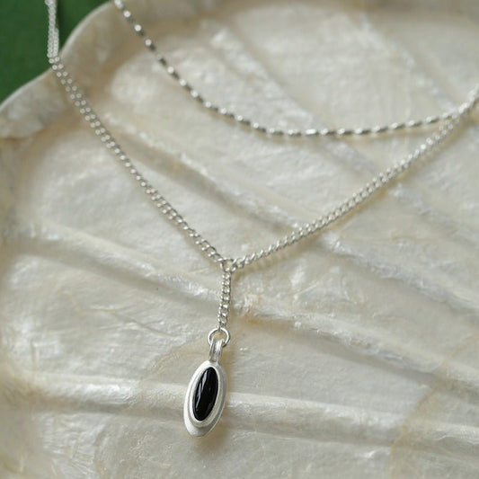 925 Silver Necklace: Wood-grain Marble&Black Onyx & White Mother of Pearl Pendant