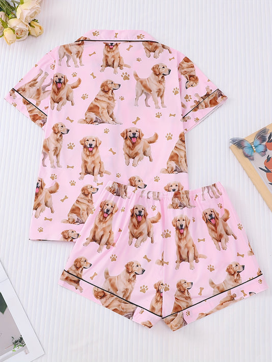 2pcs Women's Cute Golden Retriever Print Pajama Set - Short Sleeve, Casual, Comfortable for Home & Outdoor
