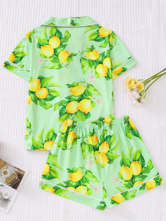 Womens Casual Lemon Print Short Sleeve Pajama Set - Soft, Breathable, Relaxed Fit, Button Up Lapel Collar Top & Shorts, Comfortable Sleepwear for Women, Perfect for Lounging and Sleeping