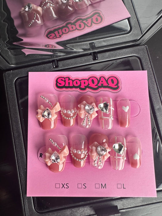Spring Love Letter | Summer Pink Plaid Glittery Sweetheart Bow Handmade Press-On Nails