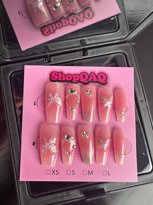 Here's a product description for your nail design: "2024 New Year Crystal Butterfly Nails | Sweetheart Girl, Gentle & Clear, White-Enhancing Handcrafted Press-On Nails with Cat Eye and Blush Accents"