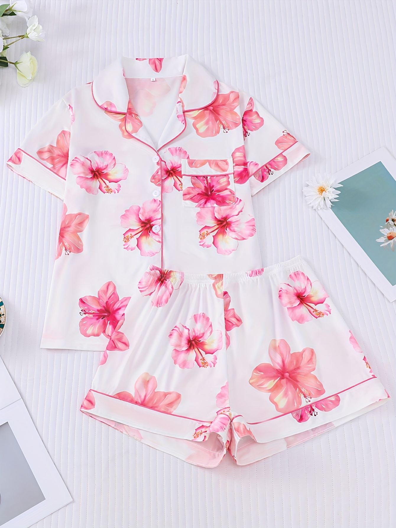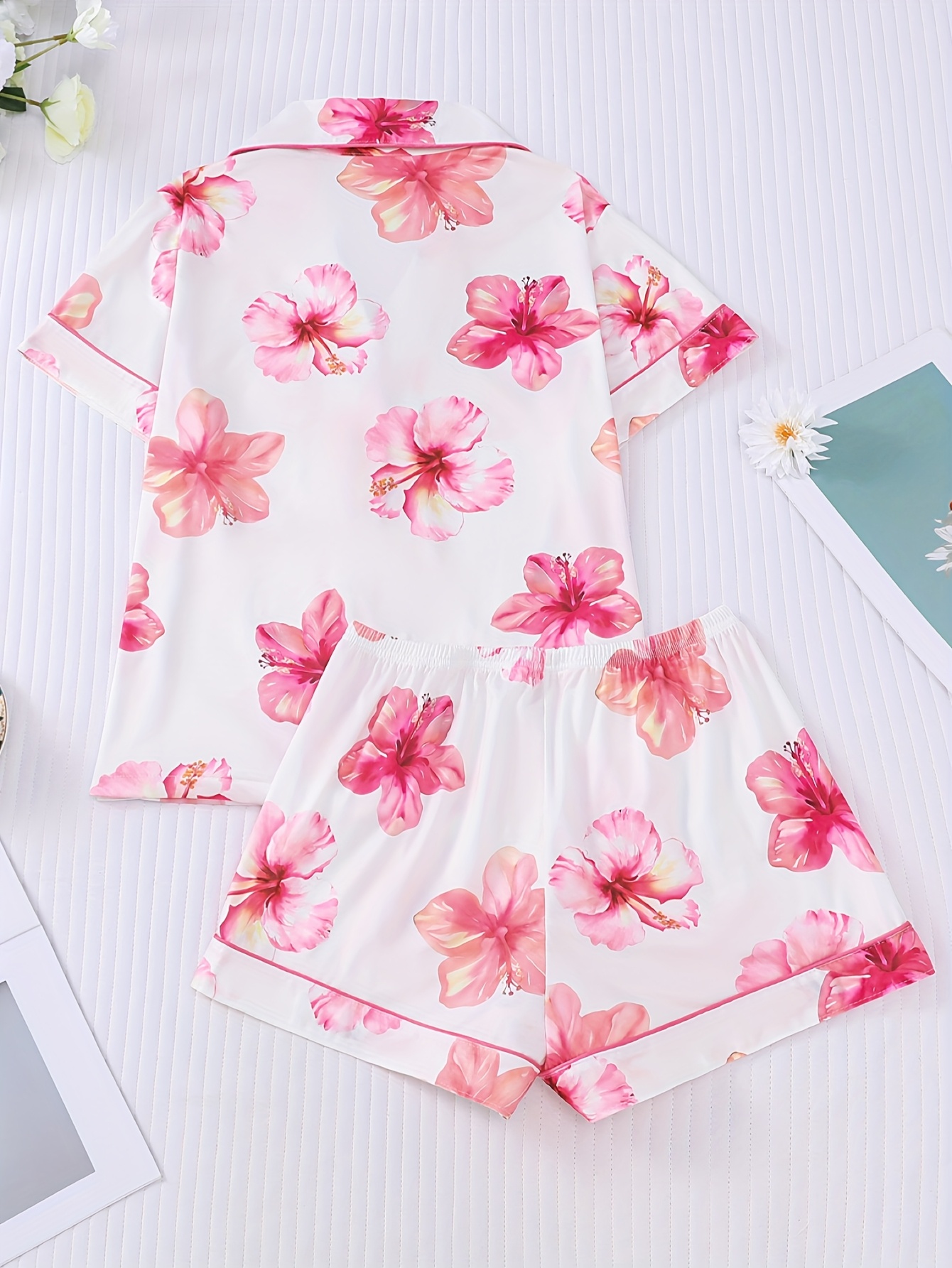 2pcs Floral Print Women'S Pajama Set, Short Sleeve Shirt with Collar and Button Top, Loose Elastic Shorts, Casual Outdoor Home Comfortable Sleepwear and Loungewear