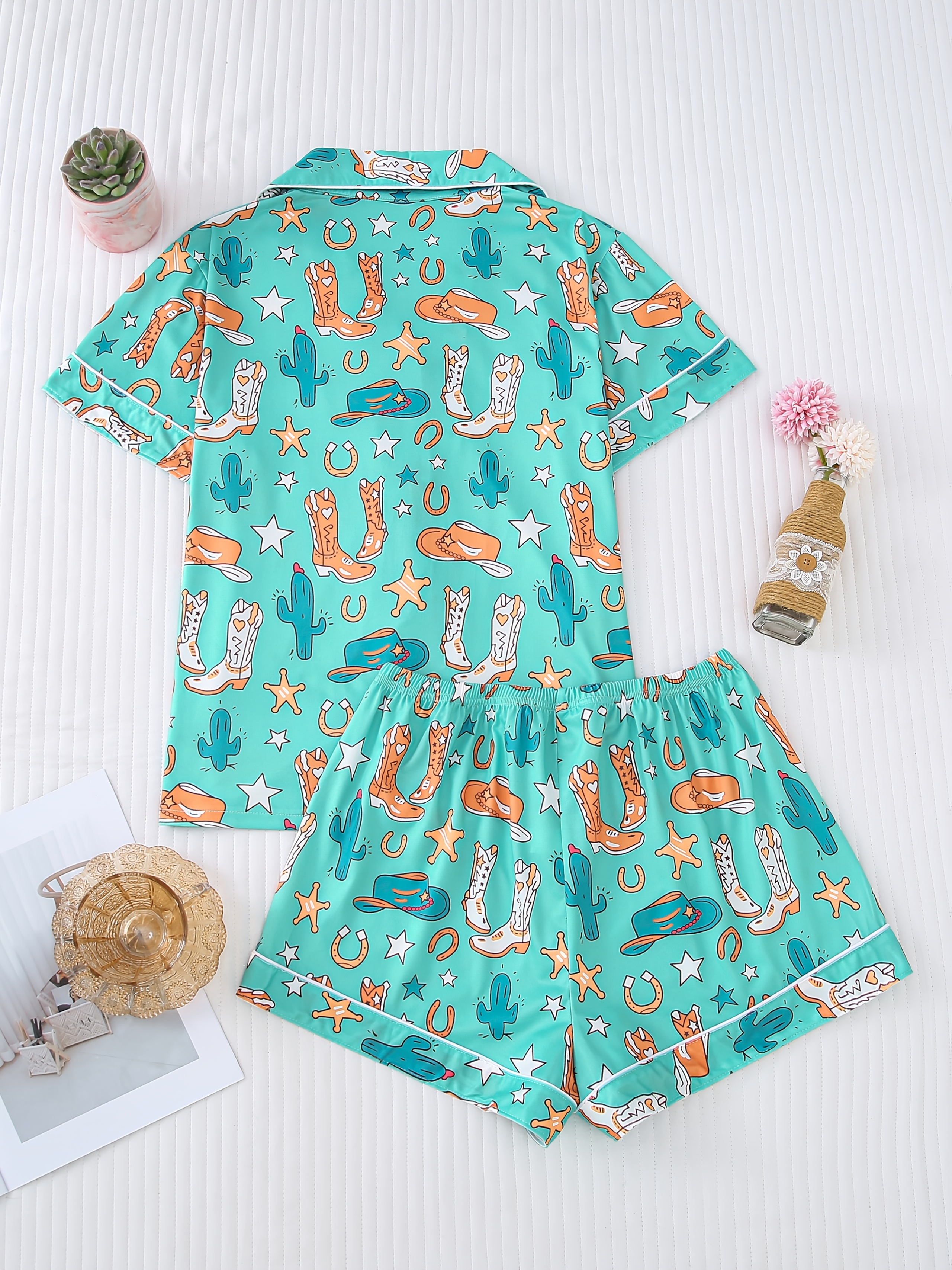 2pcs set of denim element printed Women's pajamas, short-sleeved shirt with turned collar and buttoned top and loose elastic shorts, comfortable ' sleepwear and loungewear for leisure outdoor use at home