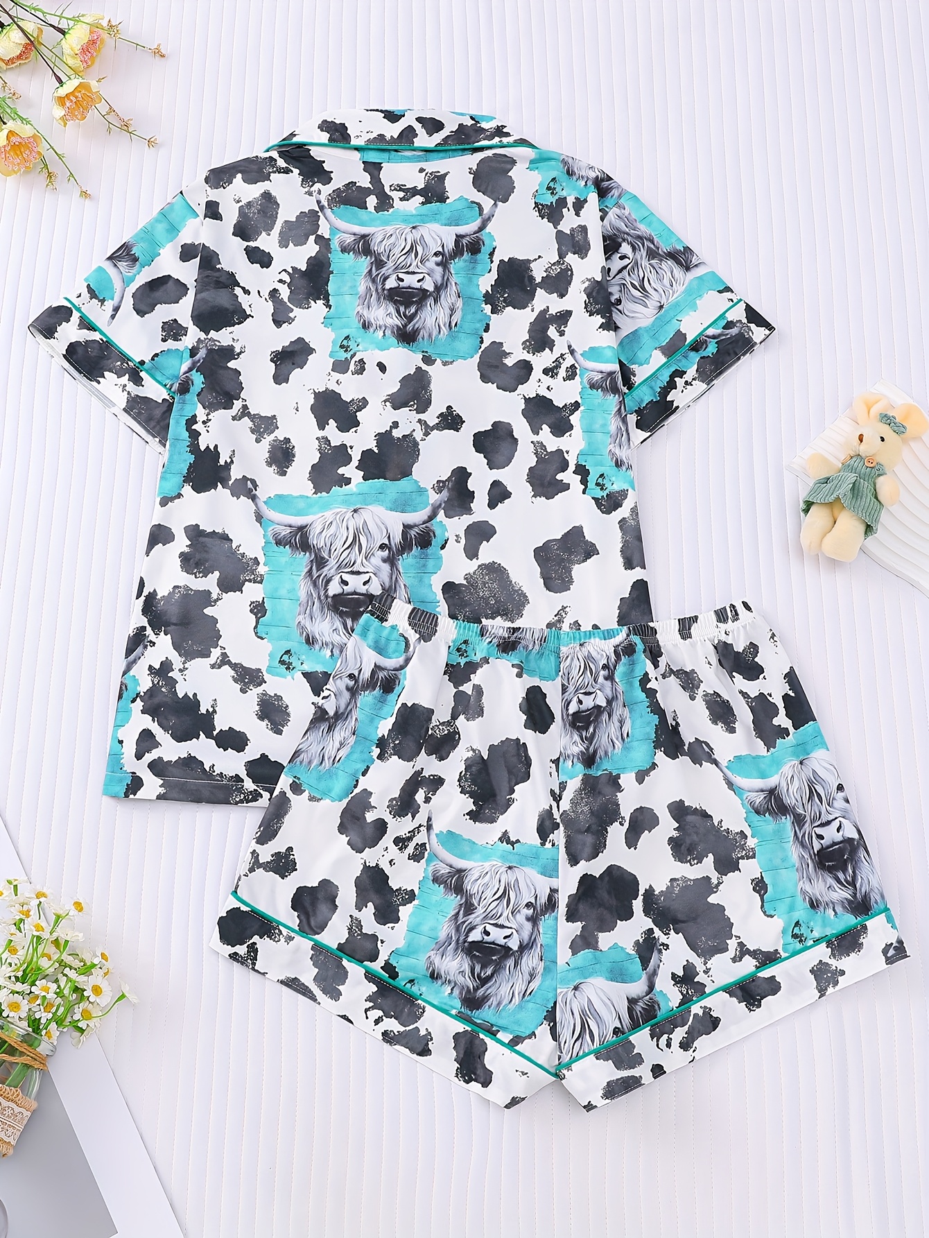 2pcs Women's Pajama Set - Animal Cow Ink Style, Short-Sleeved, Comfortable, Loose Elastic Shorts for Leisure & Home