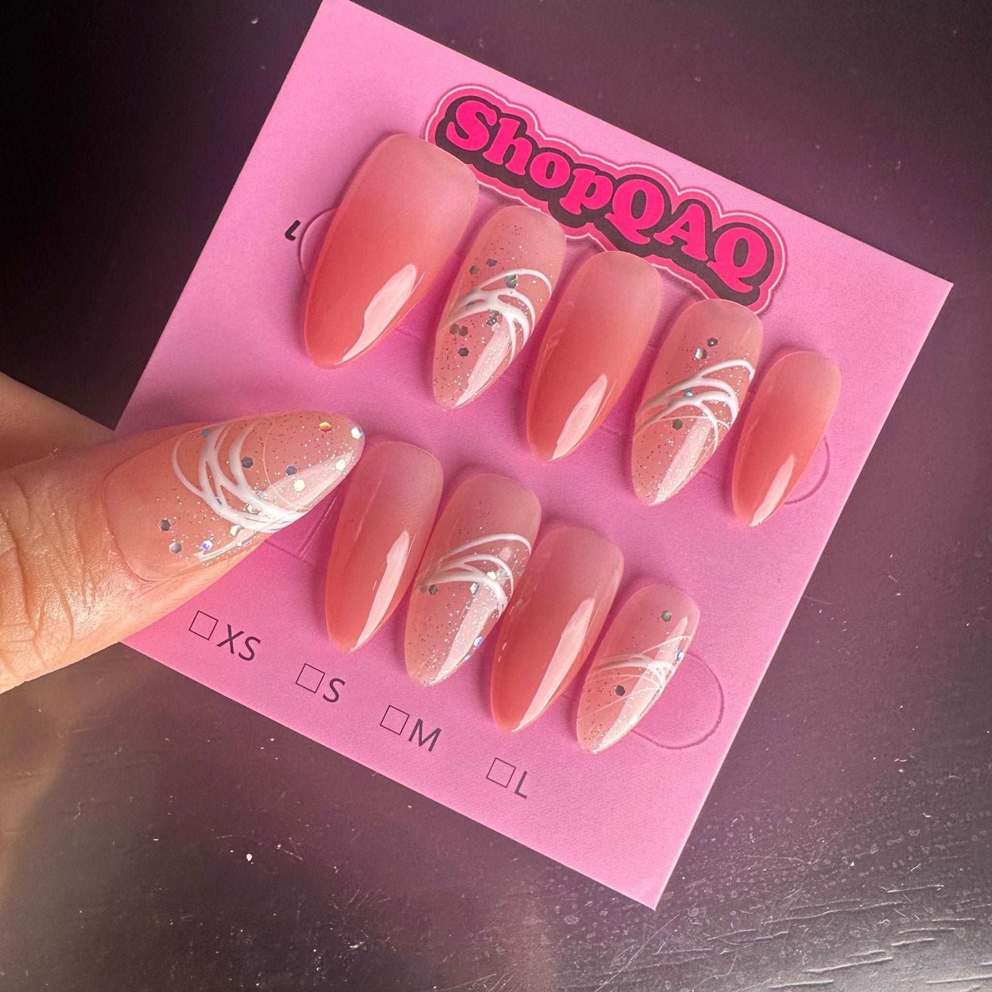Elevate your nail style with our Almond-Shaped Pink & White Brushstroke Sparkling Minimalist Handcrafted Press-On Nails. Order now to experience the beauty and simplicity these exquisite nail art pieces bring to your look.
