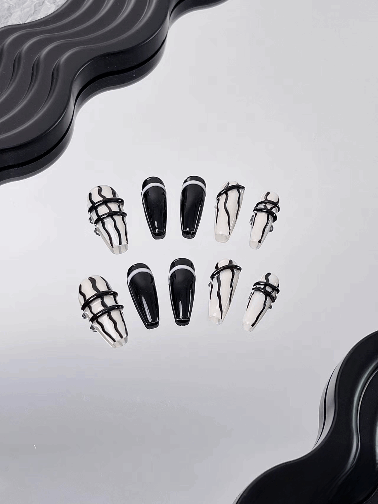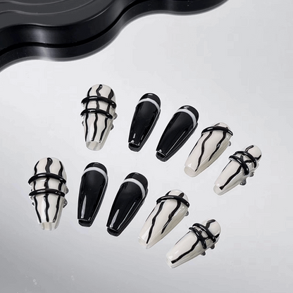 Our  press on nails are a unique addition to your spooky holiday look. Crafted with a black and white texture, these coffin-shaped nails add a stylish edge to any ensemble. Dare to be different this Halloween with these edgy and eye-catching nails