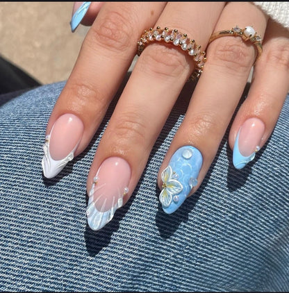 Handcrafted with precision, these press on nails are made from high-quality materials, ensuring durability and a comfortable fit. The nails come in a variety of sizes for a perfect match, and the easy-to-apply adhesive tabs make them quick and secure to wear. The unique design, inspired by the mythical beauty of mermaids, is enhanced by the soft, pearlescent finish that shifts color with the light, creating a magical effect. Whether you're planning a beach getaway or simply want to channel a coastal vibe, these nails offer a salon-quality finish that is both stylish and sophisticated