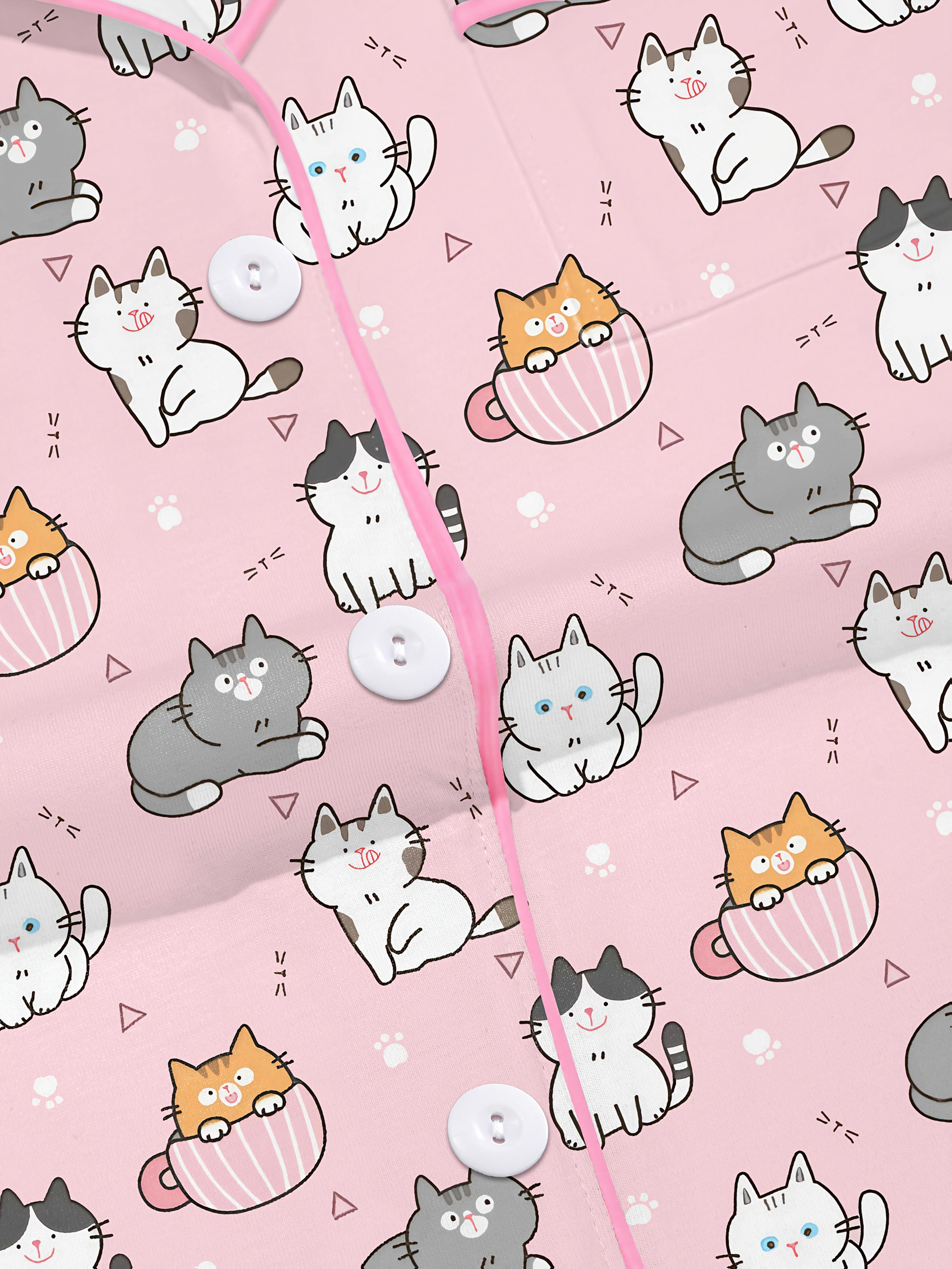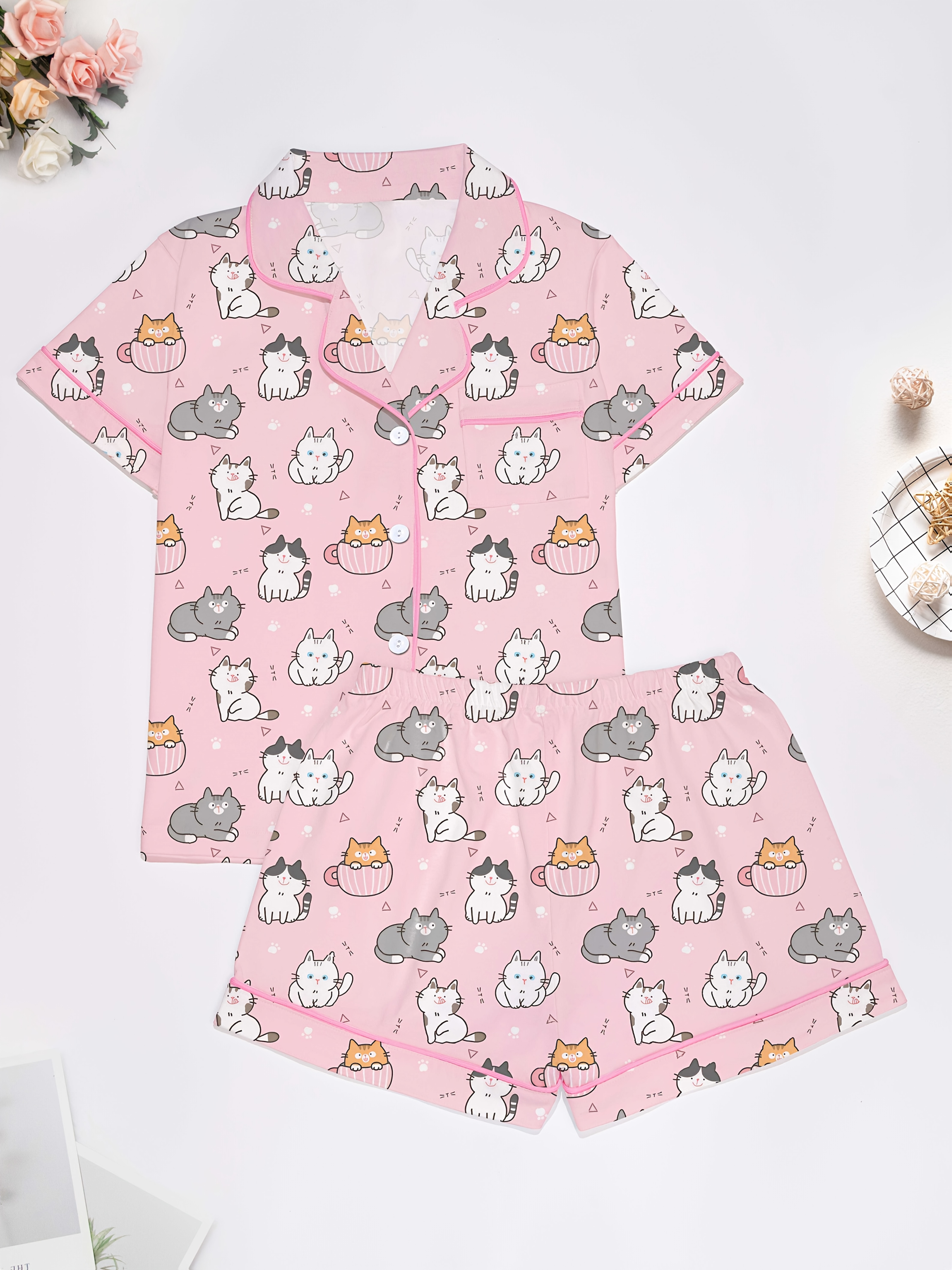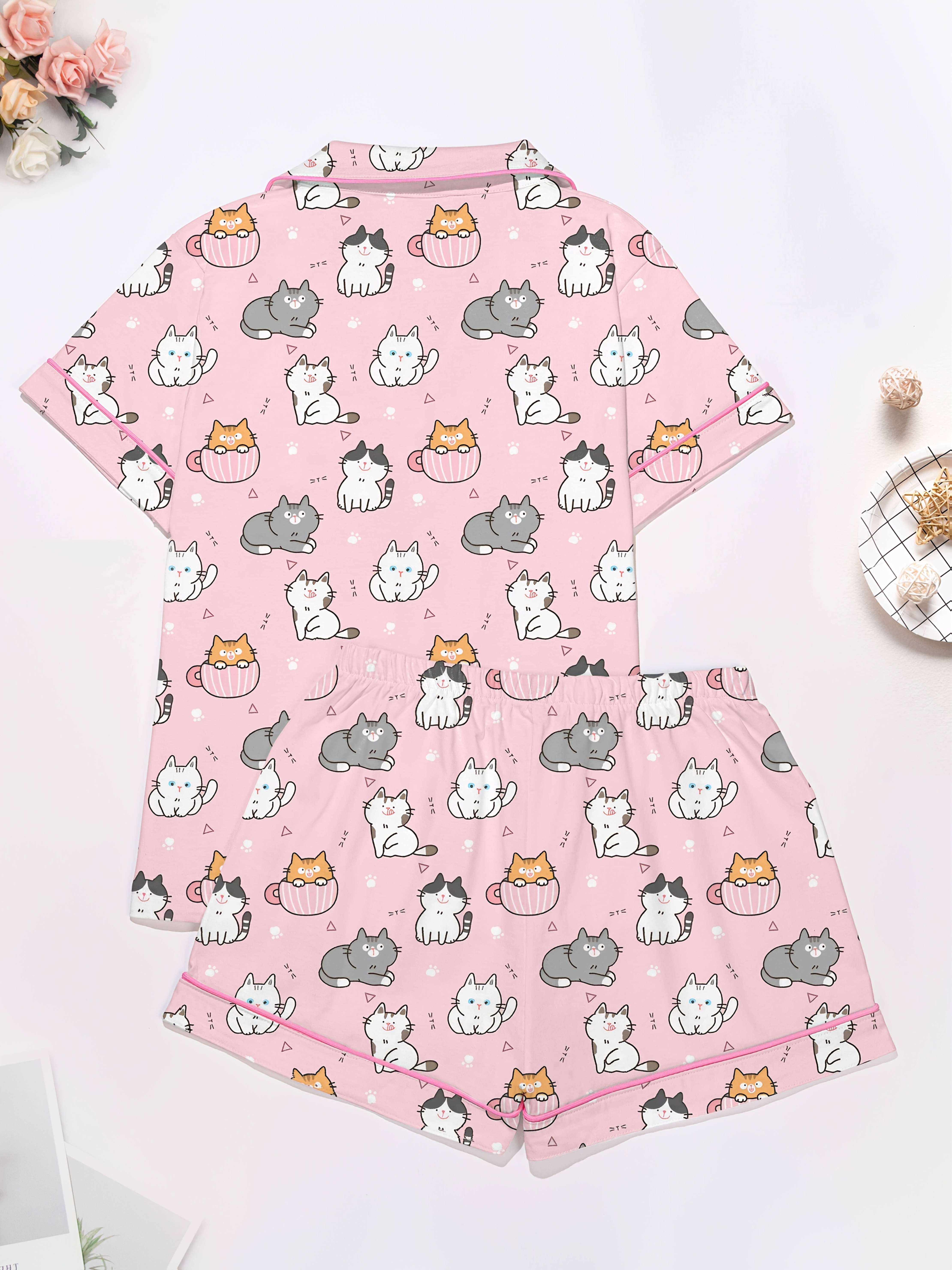 Moonlight Meow Silk‑Touch Modal Pajama Set — Short‑Sleeve Button Top + Elastic‑Waist Shorts