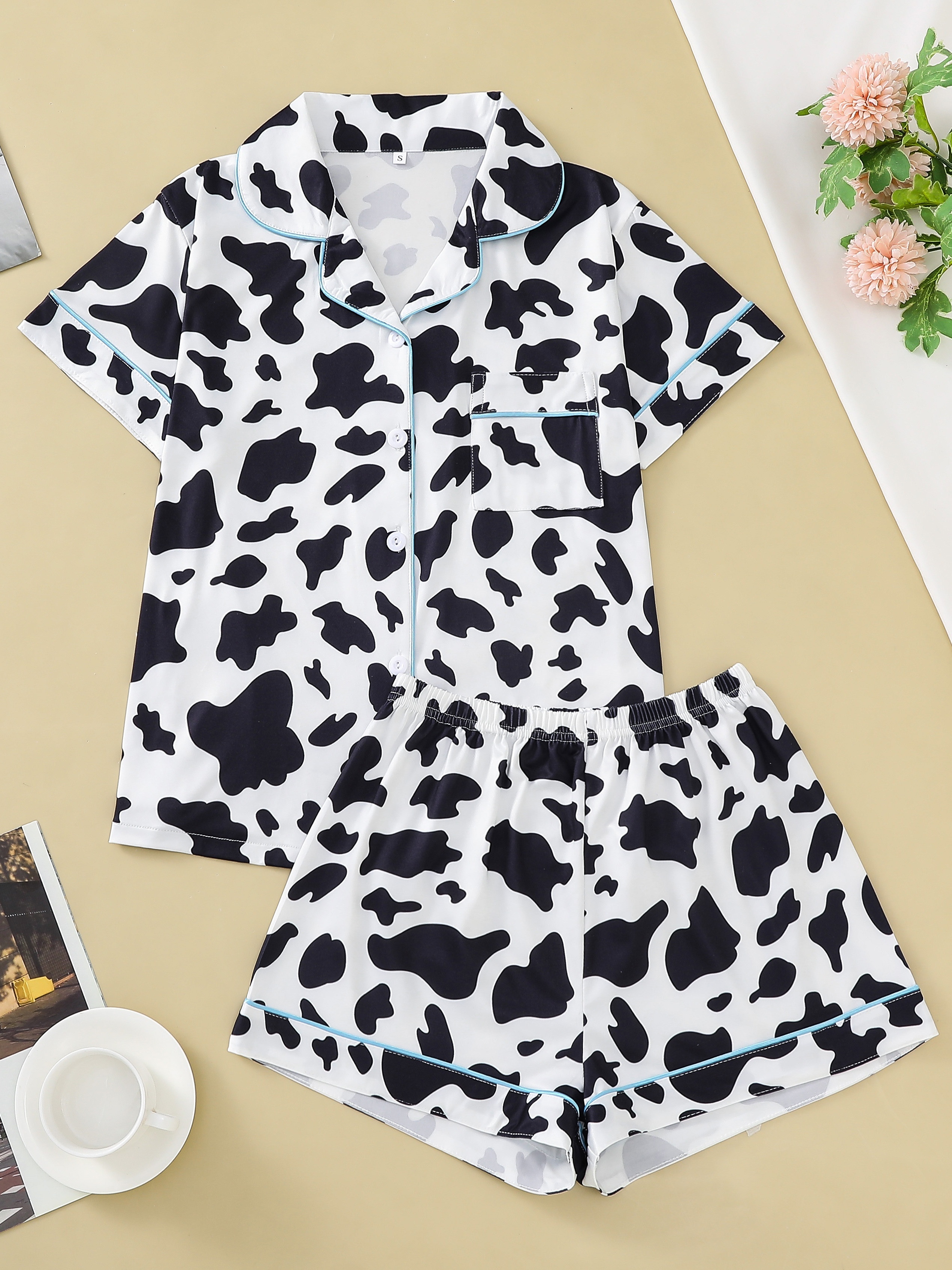 Moonlit Dairy Silk‑Touch Modal Pajama Set — Short‑Sleeve Button Top + Elastic‑Waist Shorts