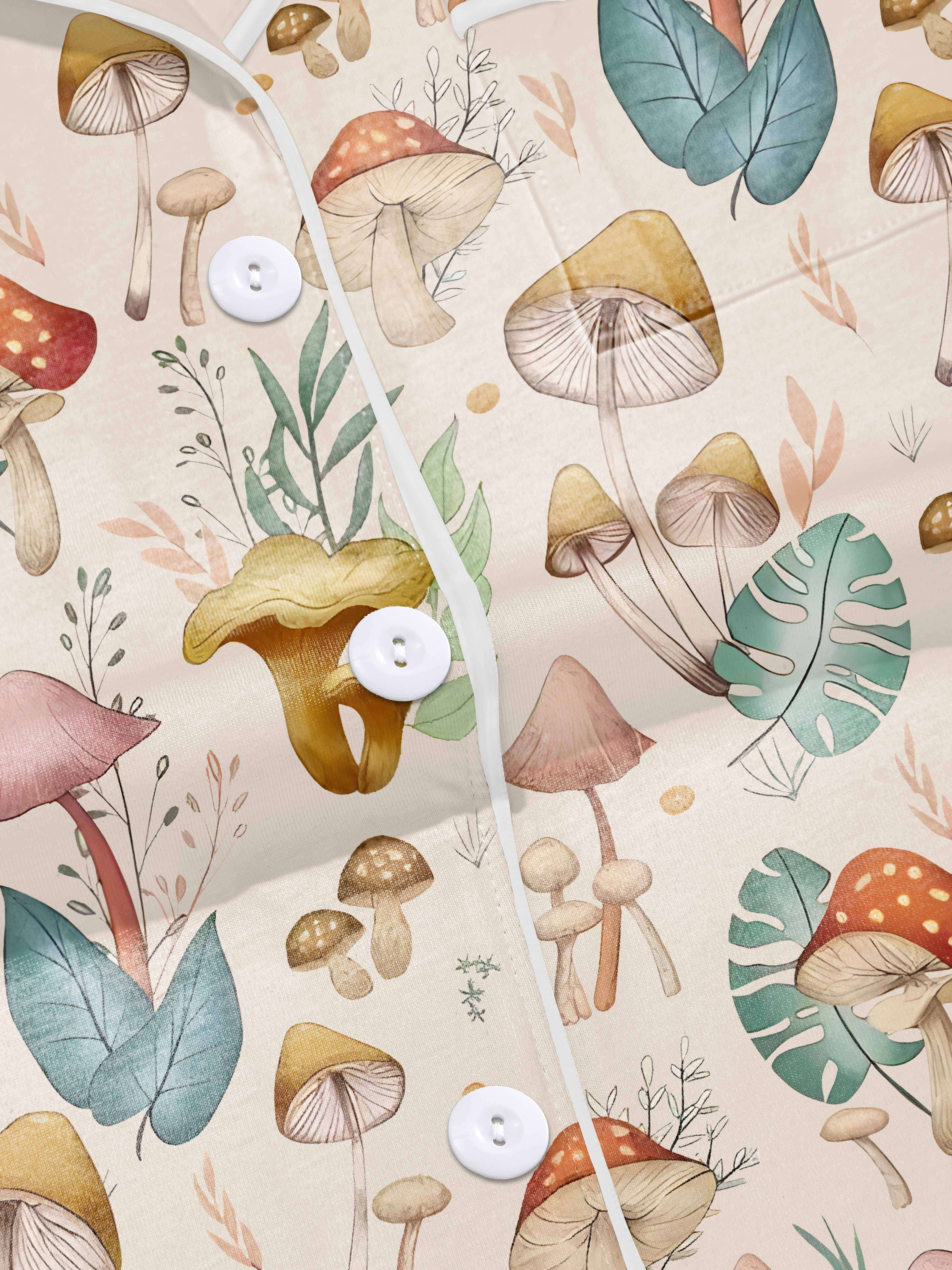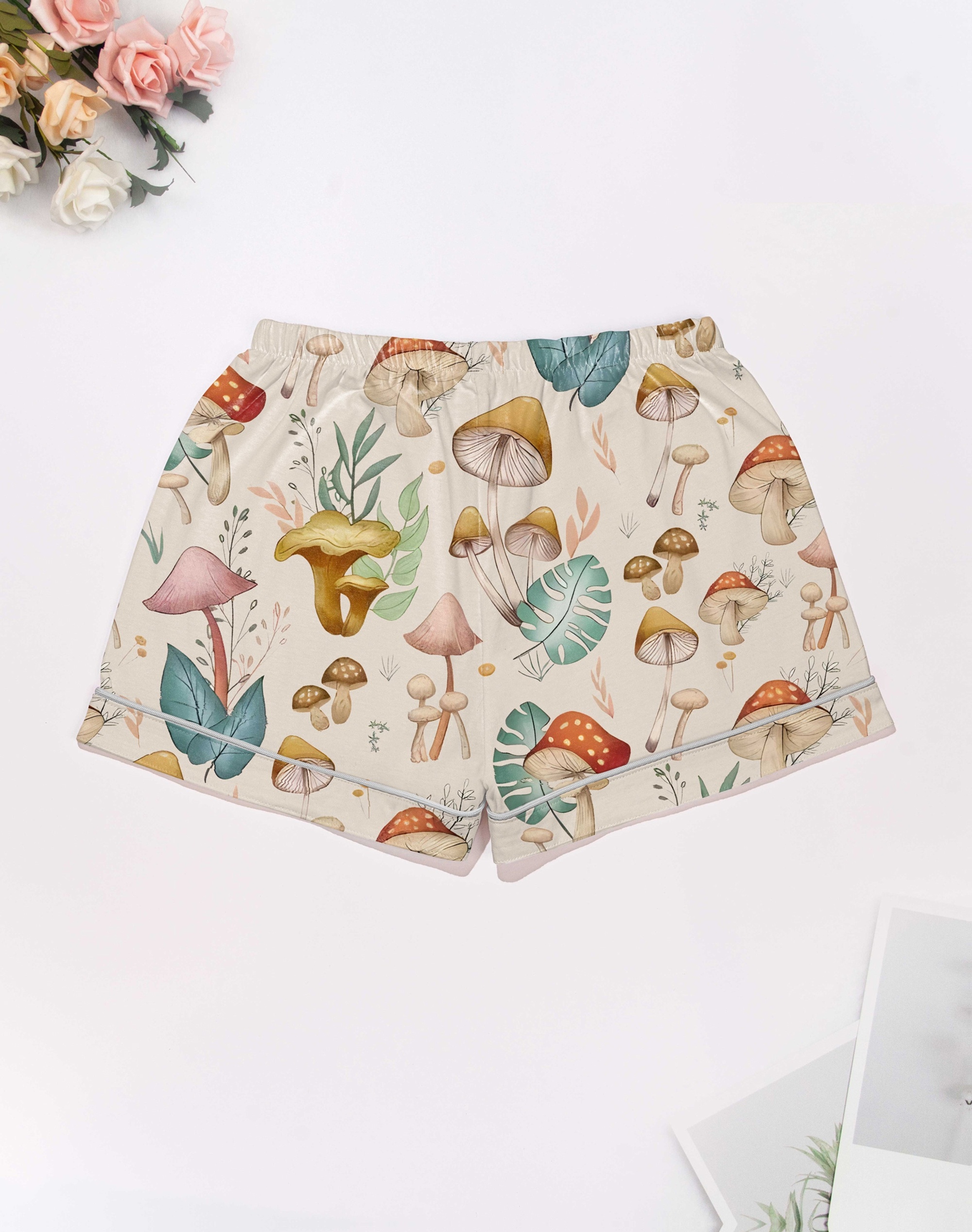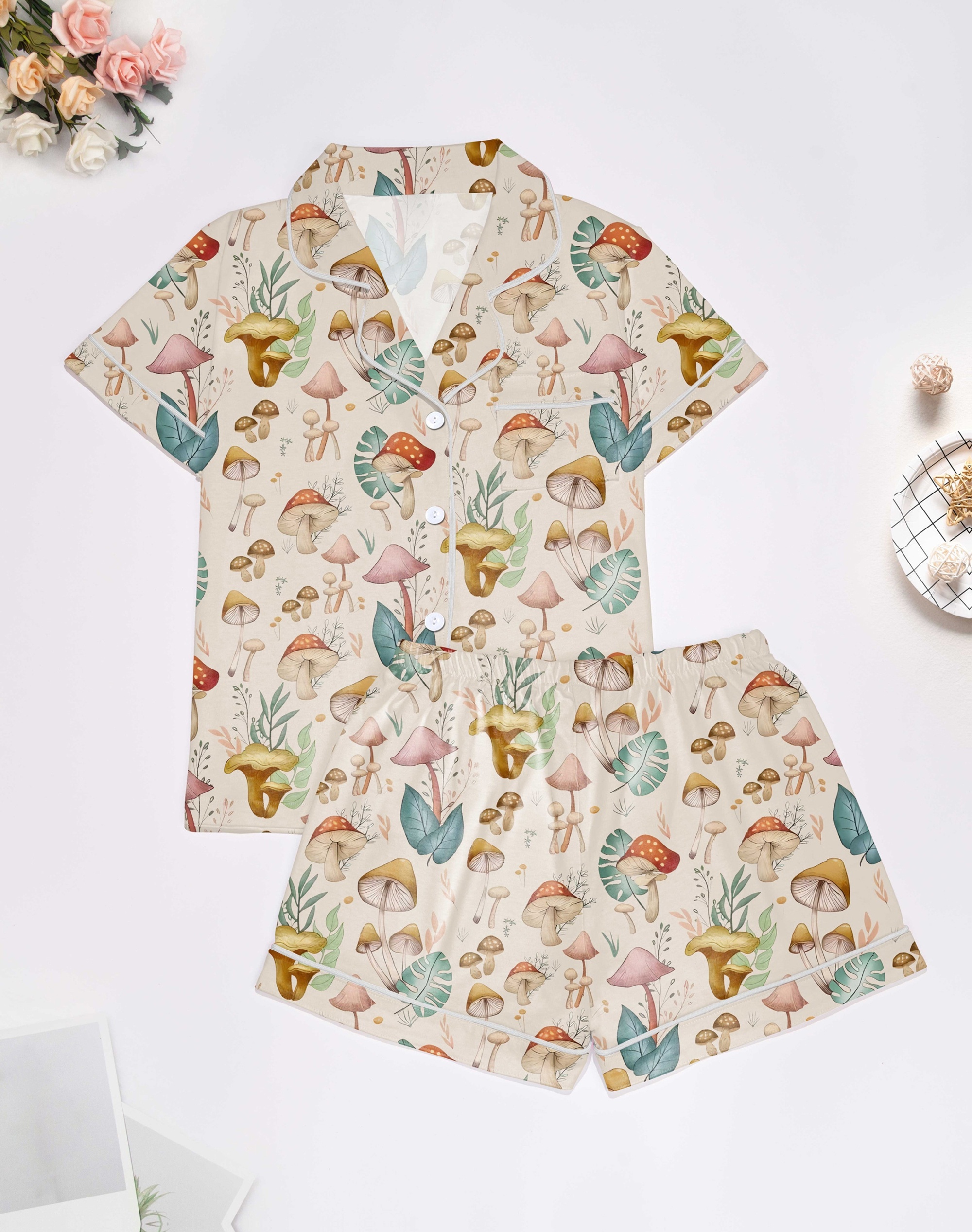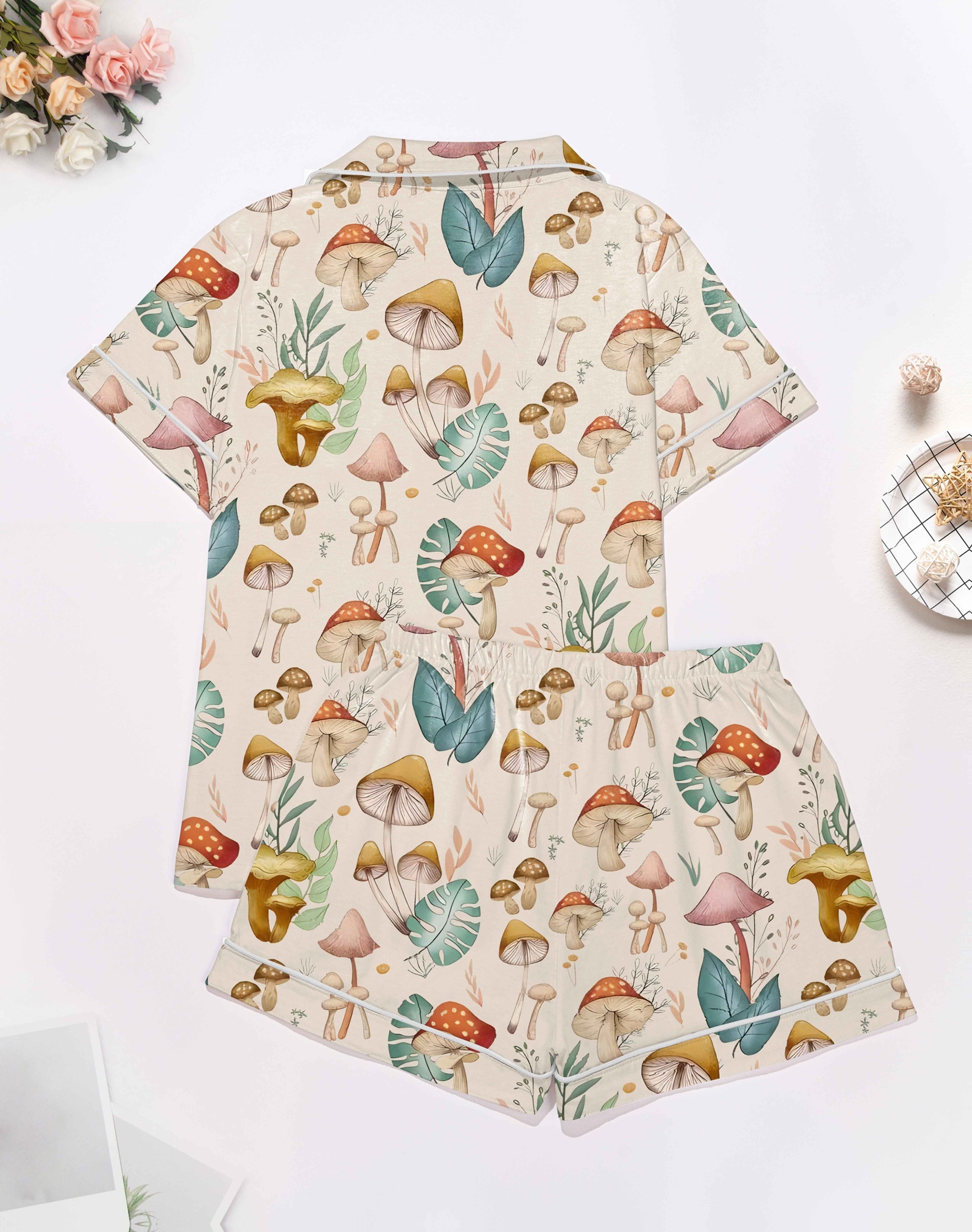 Mushroom Meadow Modal Pajama Set — Silky Short‑Sleeve Button Top + Elastic‑Waist Shorts
