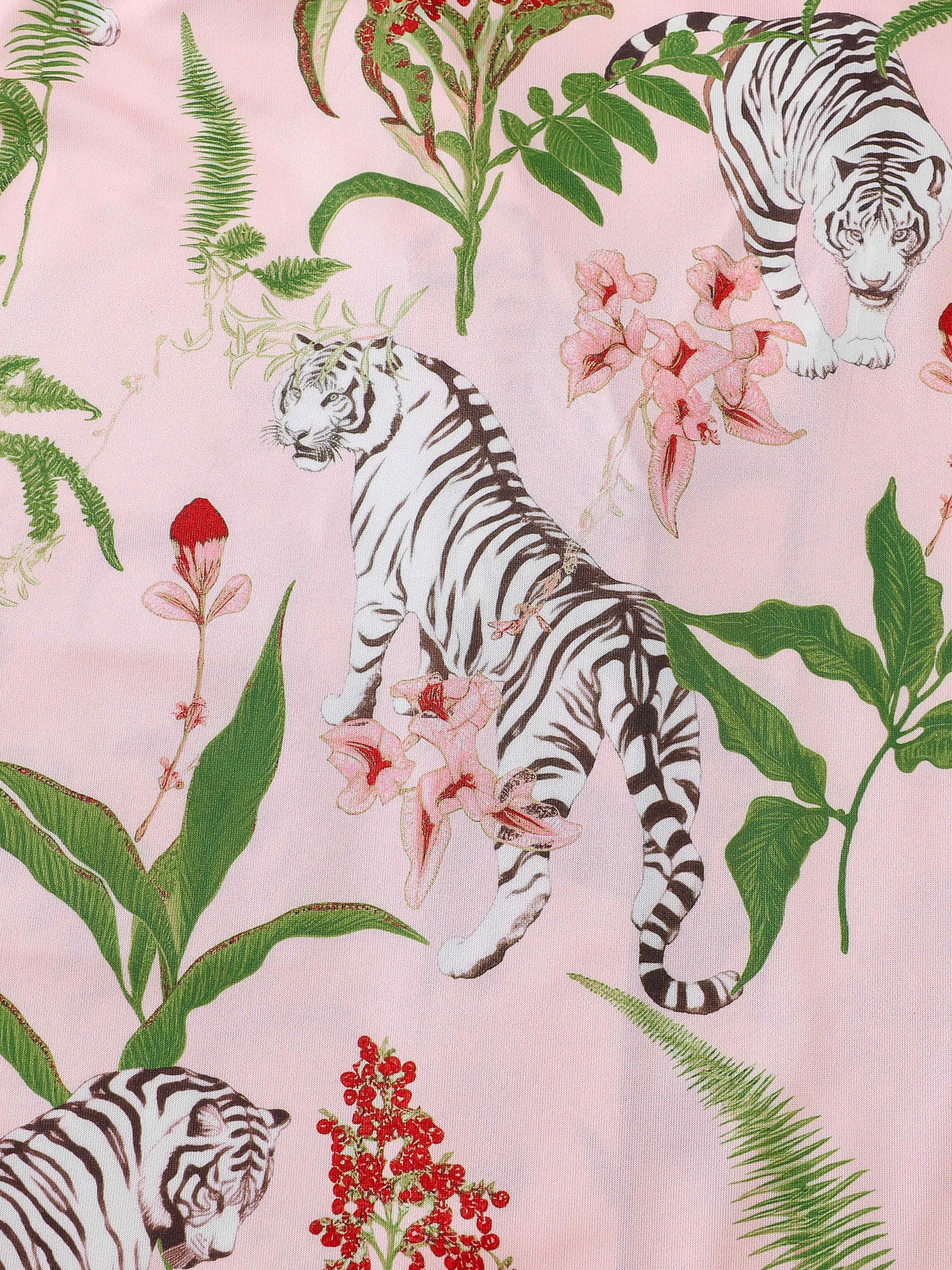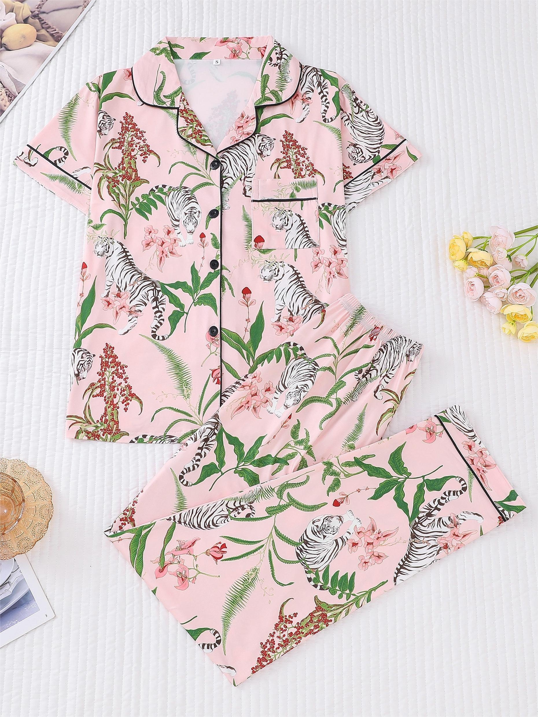 Short Sleeve Womens Tiger & Plant Print Casual Pajama Set - Soft Micro Elasticity Polyester Fabric, Relaxed Fit, Lapel Collar, Button-Down Top, Short Length Pants, Machine Washable - All-Season Comfortable Sleepwear for Adults