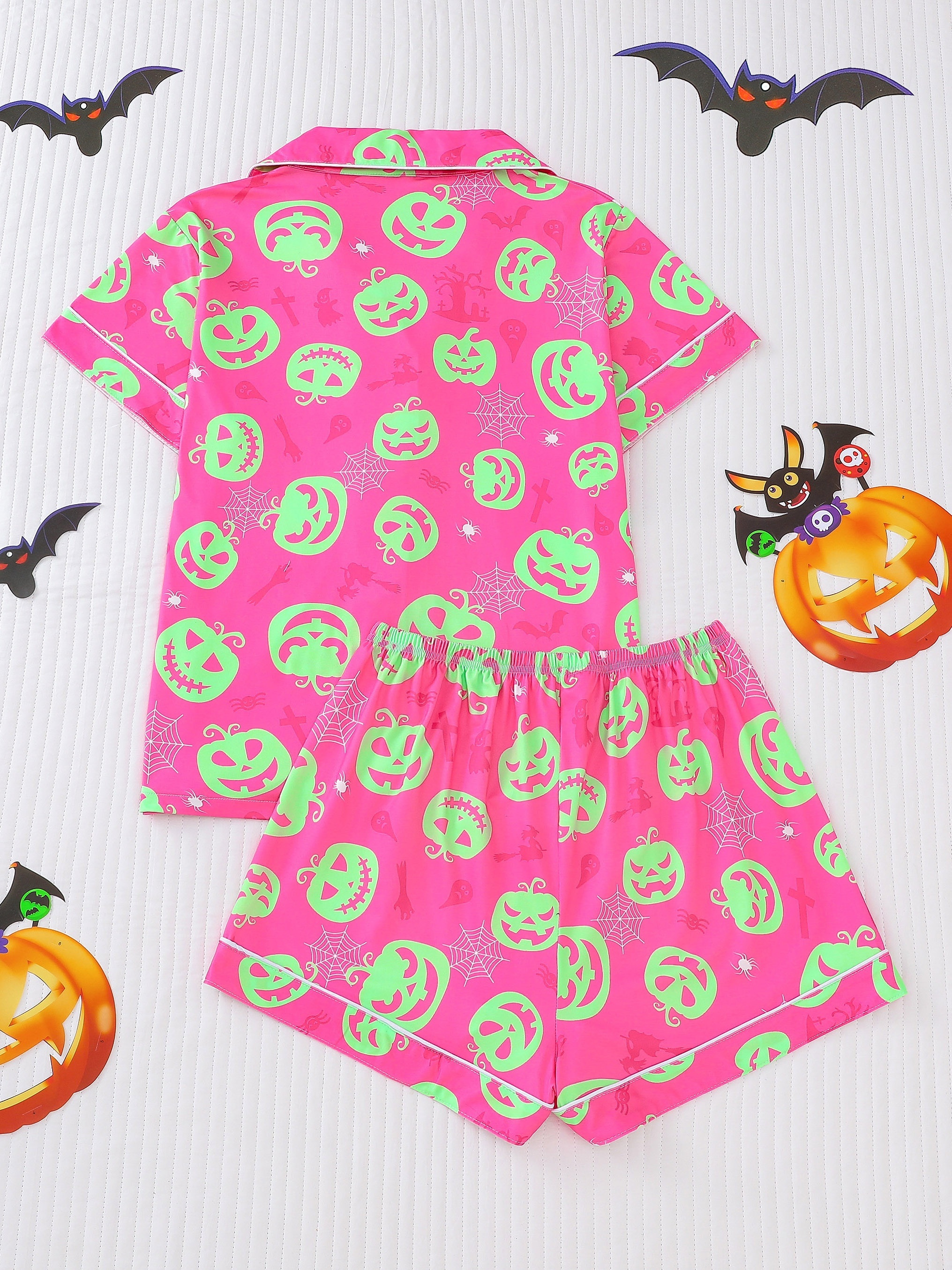 Spooky Halloween Pumpkin Bat Print Women's Pajama Set, Comfortable Short-Sleeve Button- Shirt and Loose Elastic Shorts, Casual All-Season Outdoor Loungewear for Home