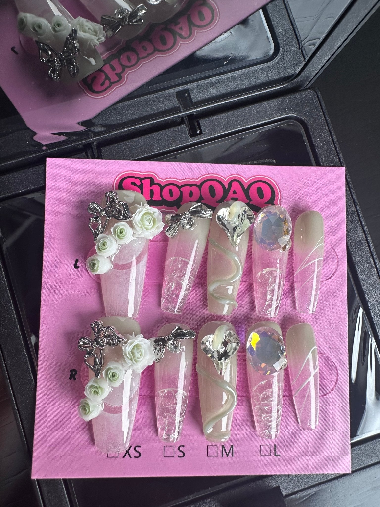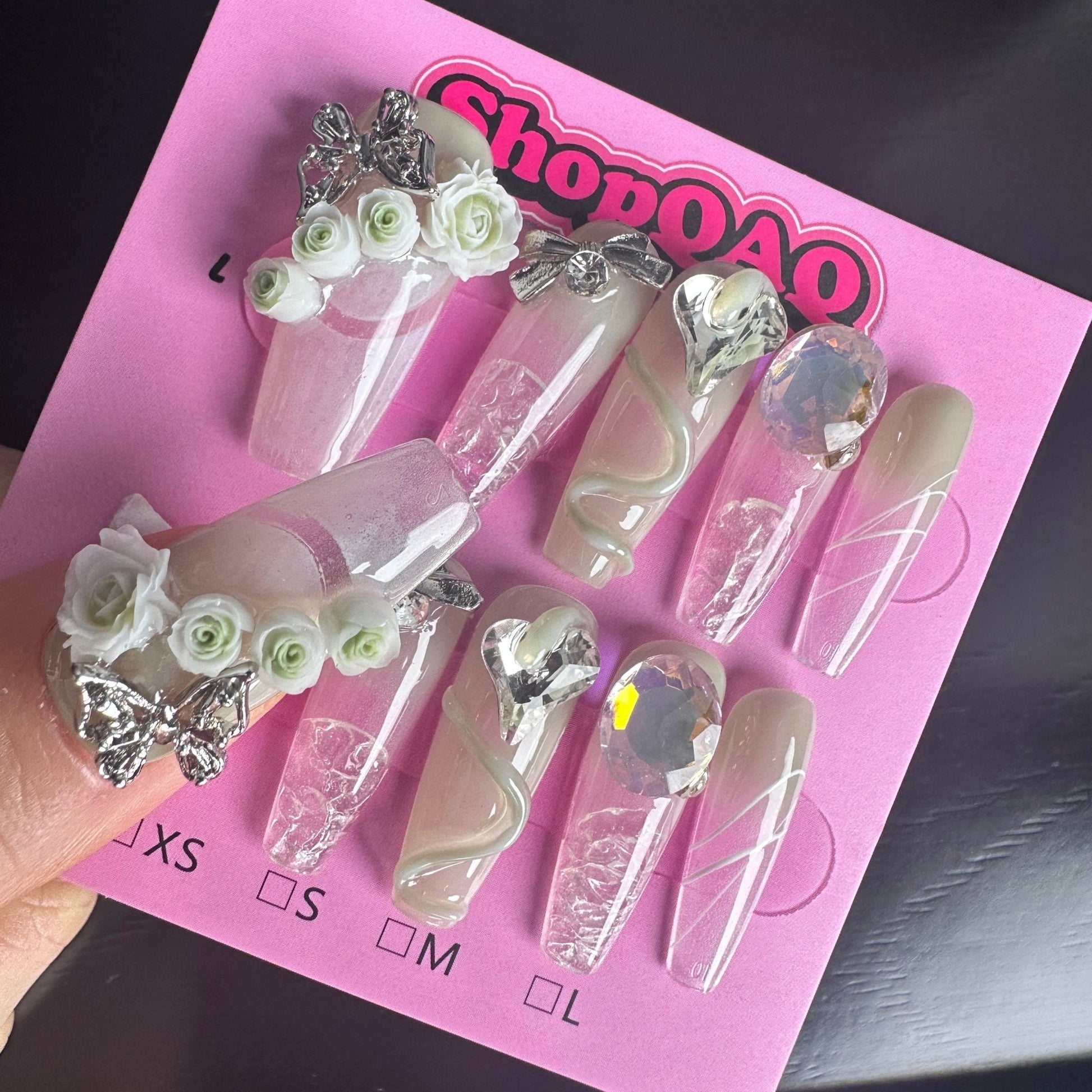 • Pigeon Egg Gemstone Accents: Embellished with sparkling pigeon egg gemstones, these nails create a stunning, eye-catching effect that reflects light beautifully.