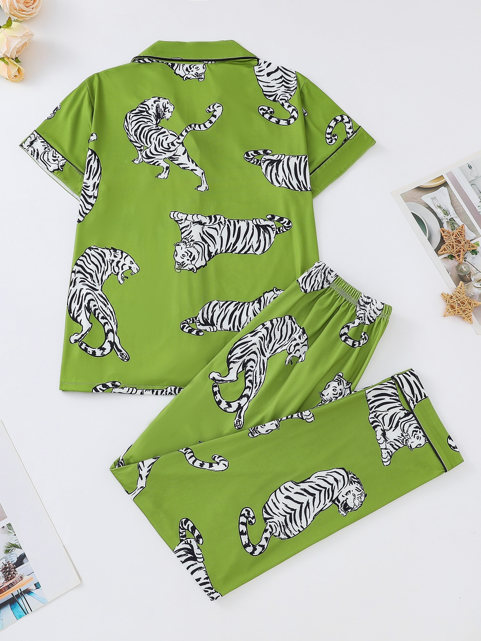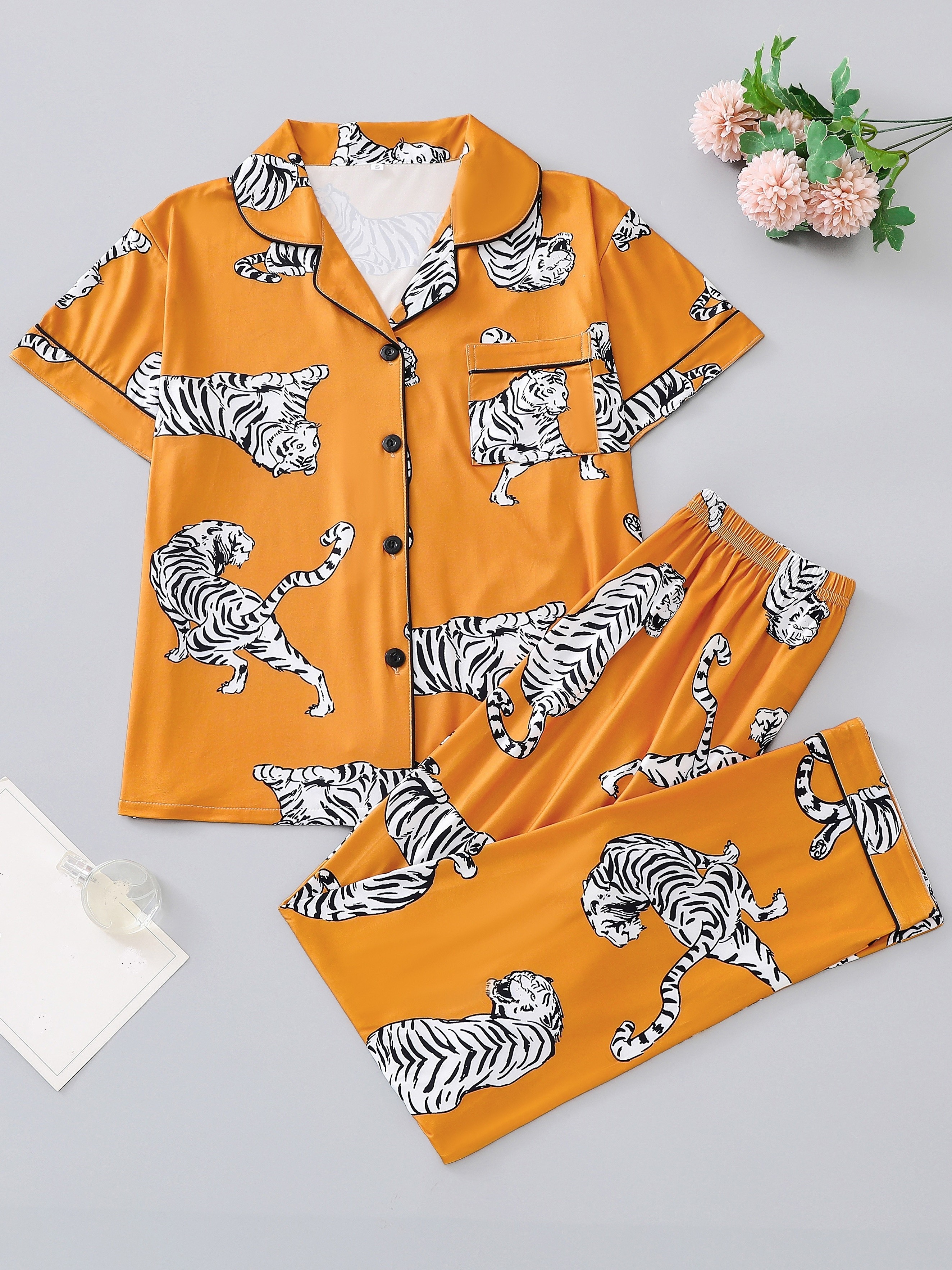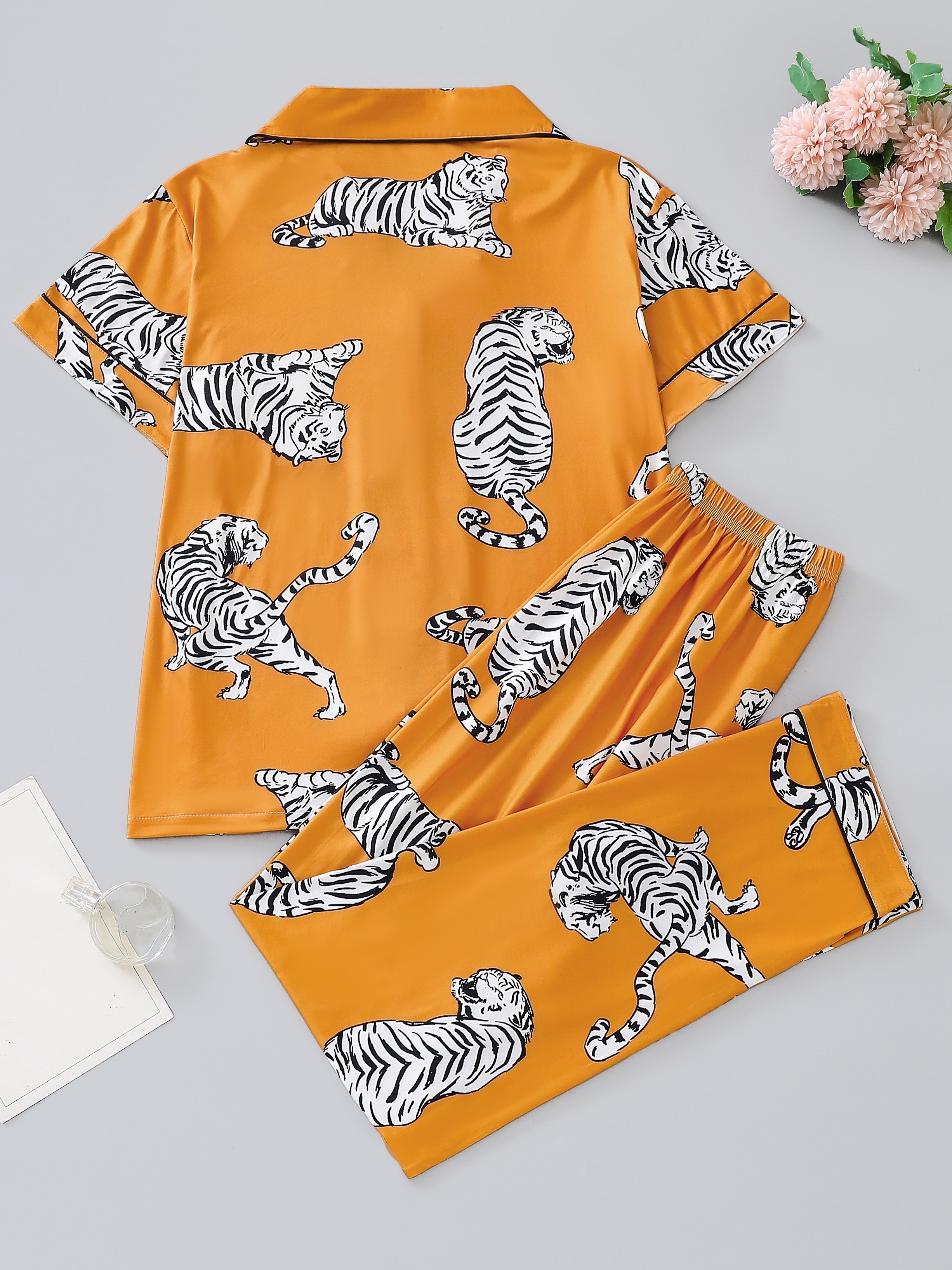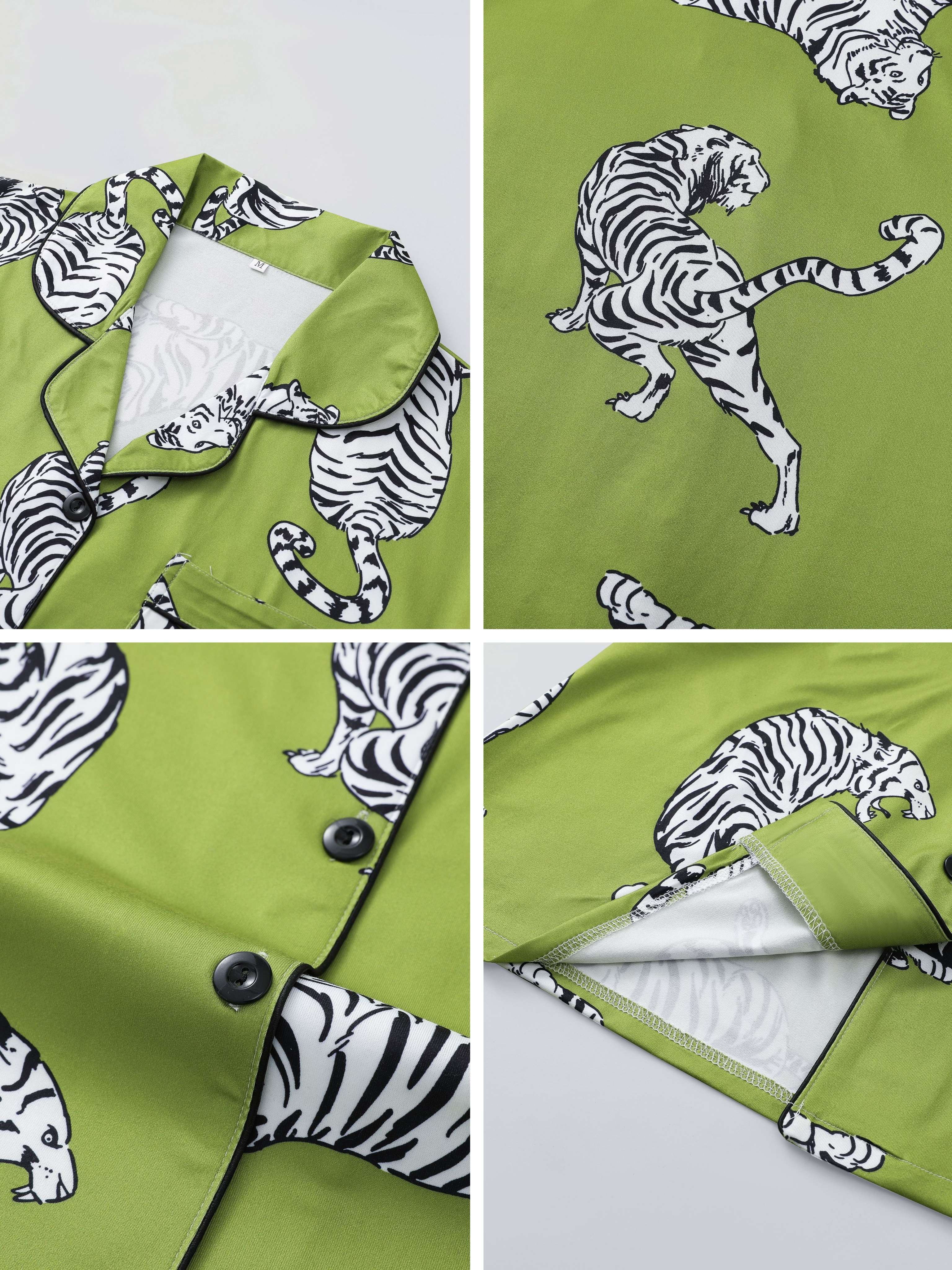 Tiger Silky Modal Pajama Set – Short-sleeved Button-down Top + Elastic Waist Shorts