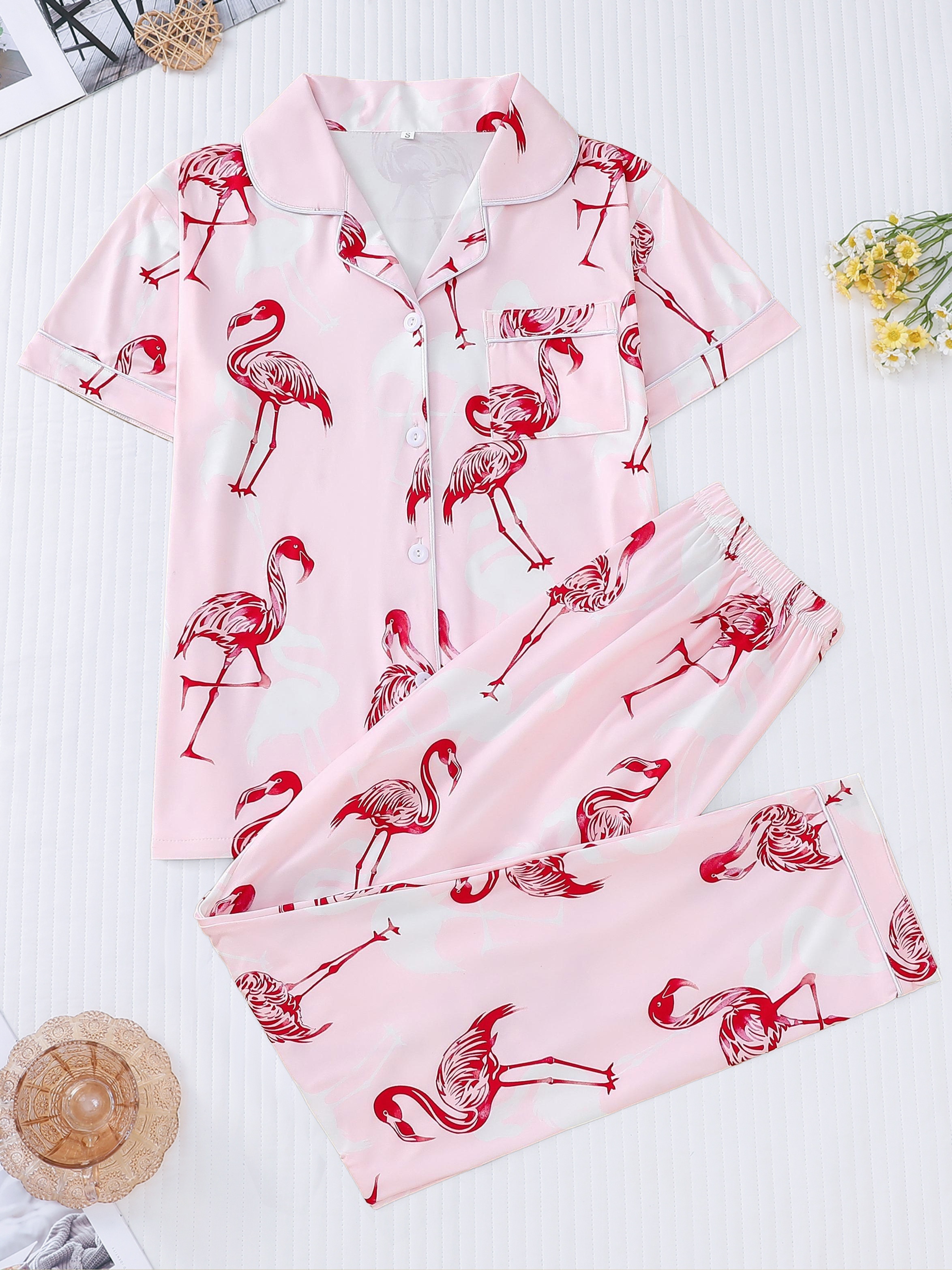 Vibrant Flamingo Print Short Sleeve Pajama Set - Soft Micro Elastic Polyester Fabric, Elegant Lapel Collar Top, Cozy Elastic Pants, Machine Washable, All-Season Sleepwear & Loungewear for Women