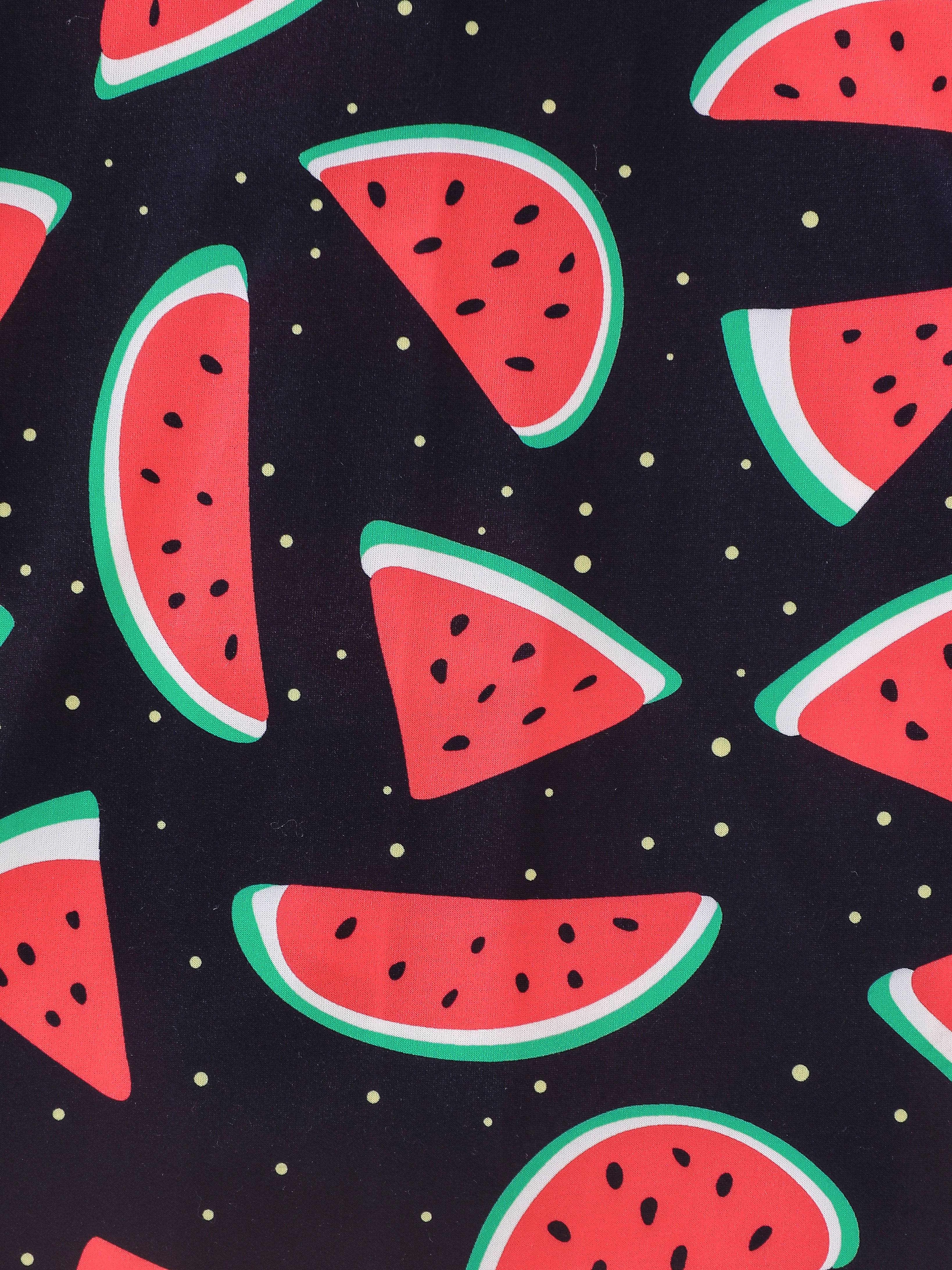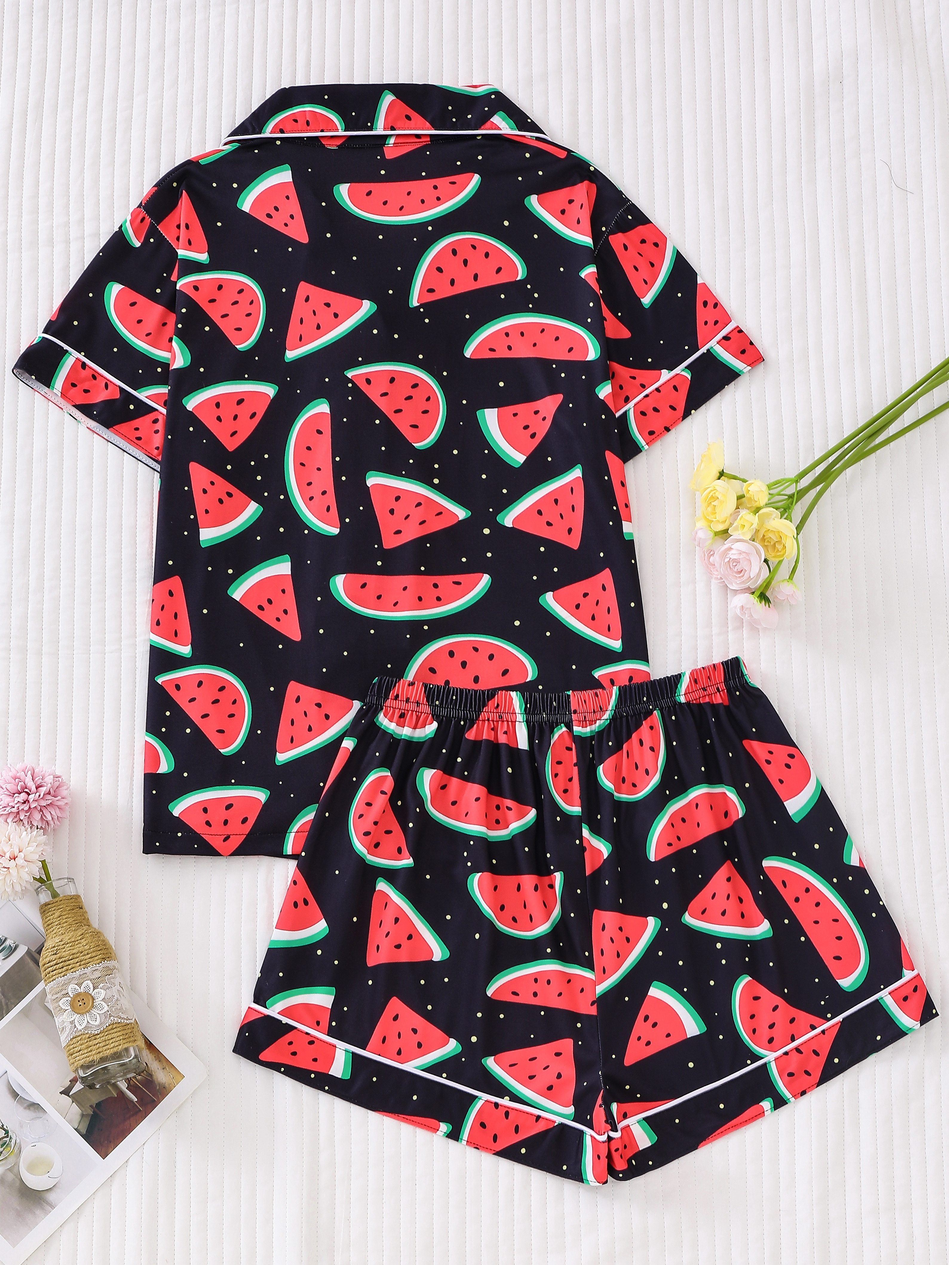Watermelon Print Pajama Set, Cute Short Sleeve Button Up Lapel Collar Top & Shorts, Women's Sleepwear