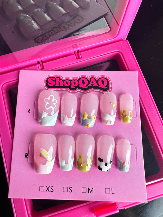 French-Inspired Brightening Nails - Hand-Painted Cute Cloud & Rainbow Short Press-On Nails