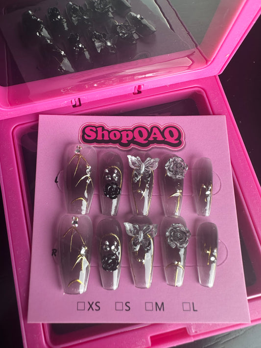 New Arrival Black Camellia Dark Gothic Press-On Nails - High-End Aurora Butterfly Handcrafted Medium Length
