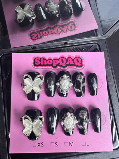 Enhance your manicure with the 2024 Latest Collection – where crystal butterflies and rose flowers meet sparkling gems in a mid-length design, creating a sophisticated and elegant look. Perfect for those who appreciate handcrafted luxury and modern charm.