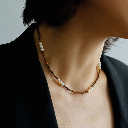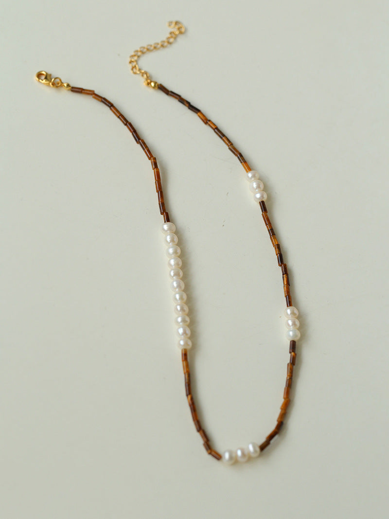 Collier Oeil de Tigre Marron et Perles d'Eau Douce