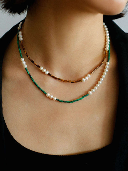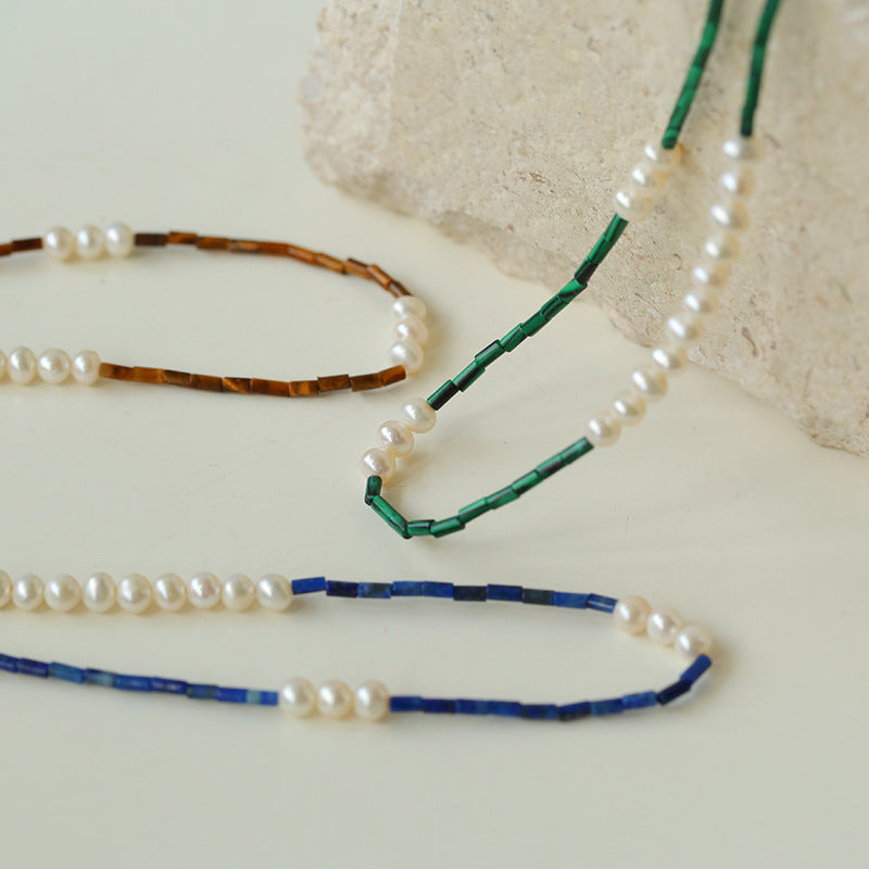 Découvrez l'union parfaite des merveilles de la nature et de l'élégance raffinée. Notre brin de véritable malachite, d'œil de tigre et de lapis-lazuli s'entrelace élégamment avec des perles d'eau douce au fini aurore. Ce chef-d'œuvre minimaliste rehausse sans effort n'importe quel ensemble, un témoignage de l'art de la sophistication polyvalente. Qu'il soit porté individuellement ou élégamment superposé, c'est un choix impeccable pour ceux qui apprécient la beauté et le savoir-faire durables. Rehaussez votre style sans effort avec ce mélange harmonieux de matériaux, où chaque élément raconte une histoire d'allure intemporelle.