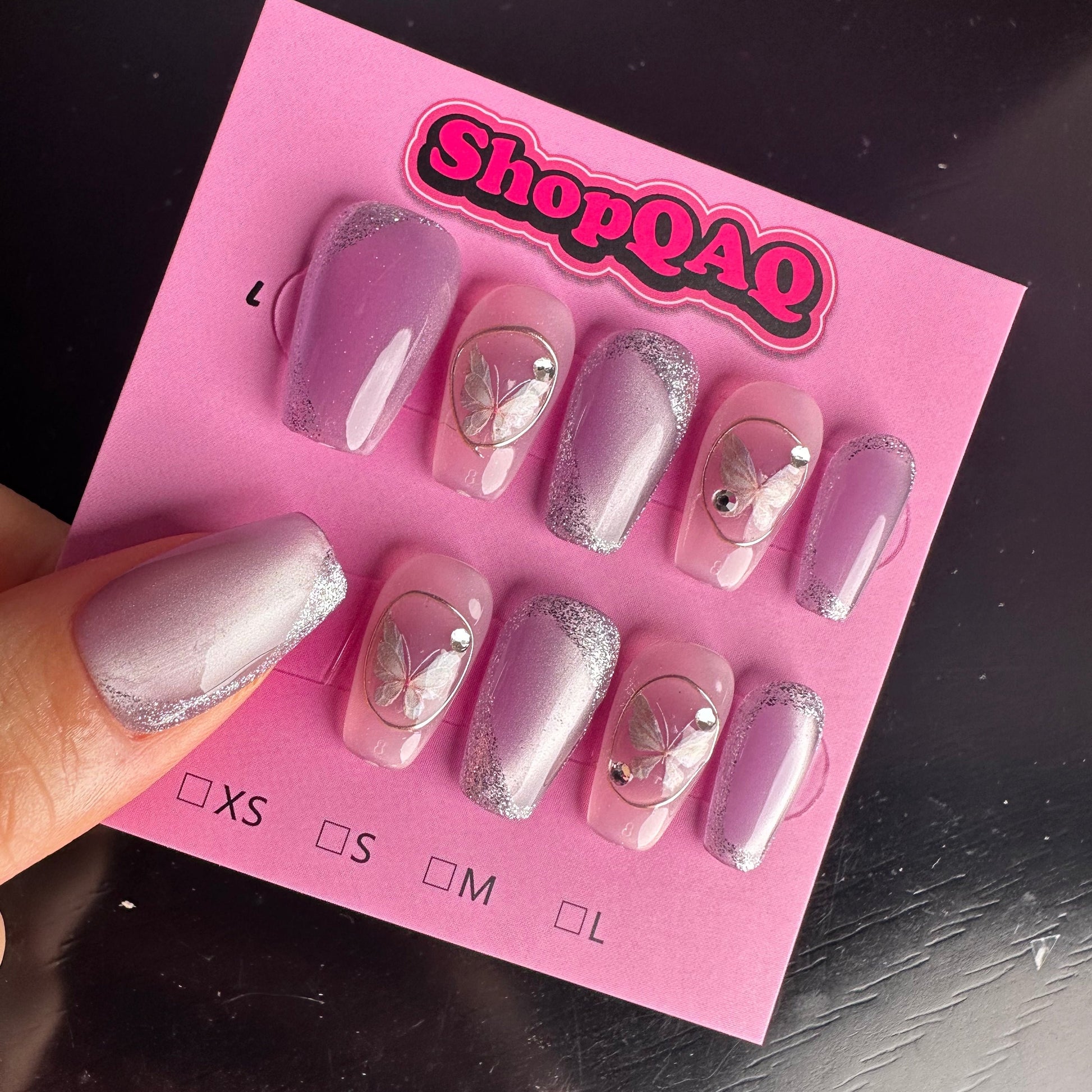 Transform your summer look with the celestial beauty of our Purple Gilded Cat Eye Butterfly Press-On Nails. Order now to experience the perfect blend of trendiness, elegance, and handcrafted artistry.