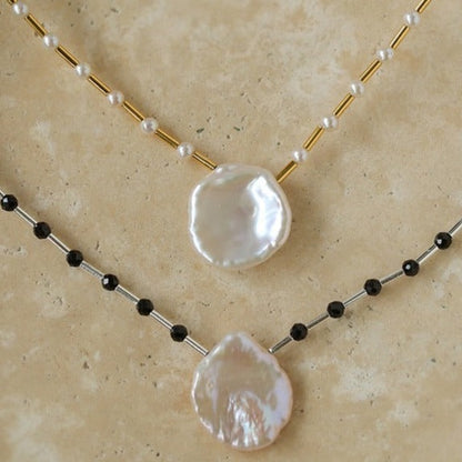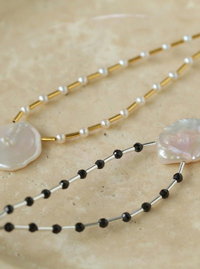 The golden necklace showcases top-tier petite pearls, while the silver variation features stunning black obsidian.