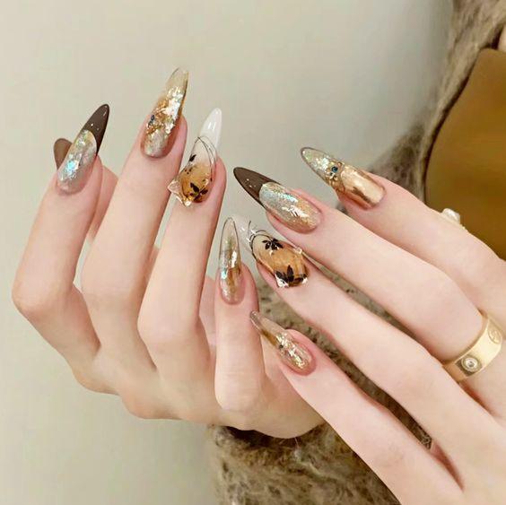 - Golden & Brown Tones: A warm blend of golden shimmer and rich brown hues reflects the cozy, romantic vibe of fall.