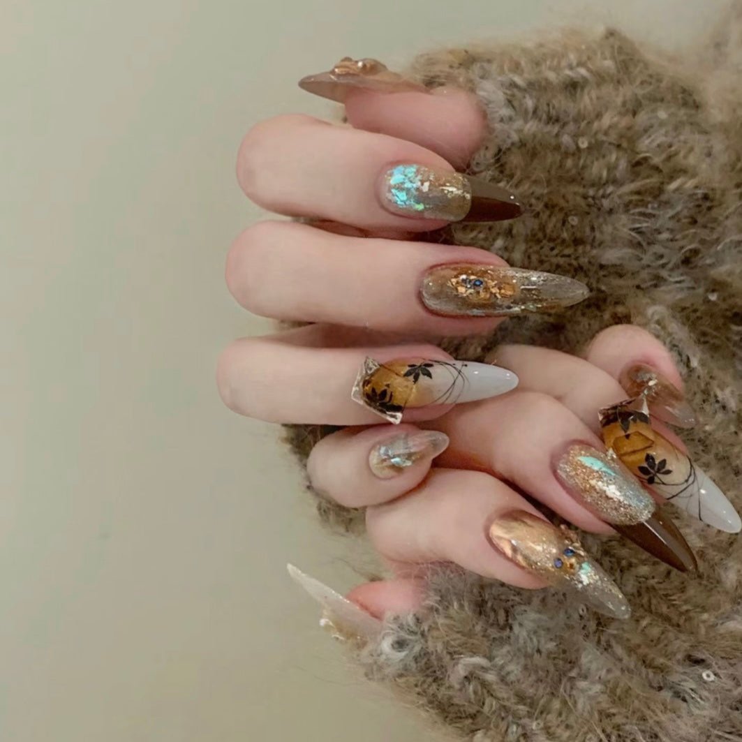 Embrace the warmth and beauty of the season with the Golden Brown Autumn Romance Press-On Nails. Inspired by the rich colors of fall, this set combines luxurious gold and earthy brown tones, capturing the romantic essence of autumn. Perfect for those who love an elegant, seasonal manicure, these nails add a soft yet sophisticated touch to any autumn outfit.