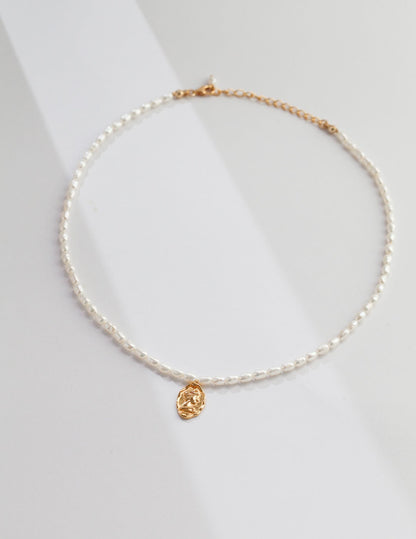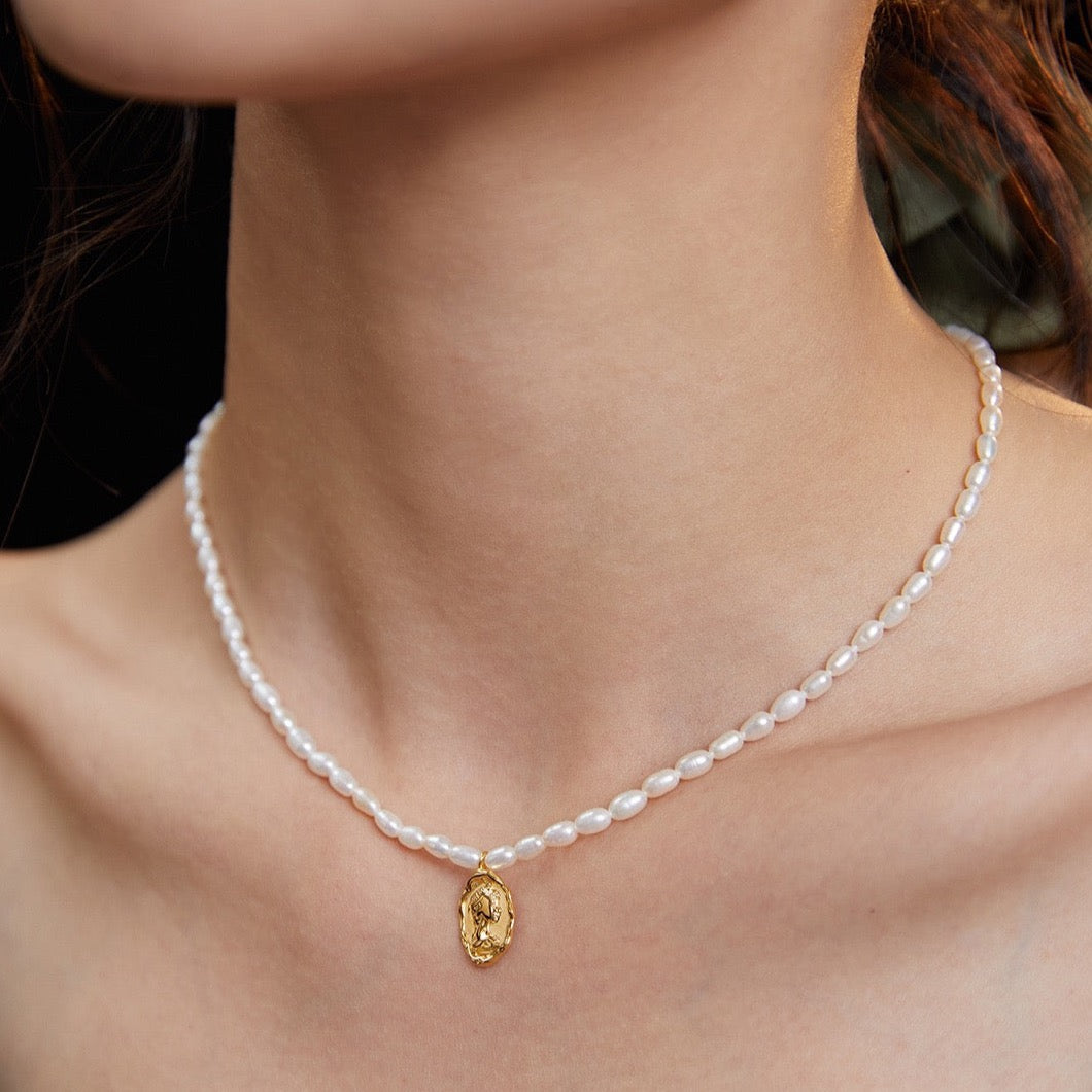 Introducing our "French Pearl Elegance Necklace," an exquisite piece that exudes sophistication and grace. This necklace is crafted from high-quality S925 silver, adorned with delicate rice pearls, and elegantly designed in vintage gold.