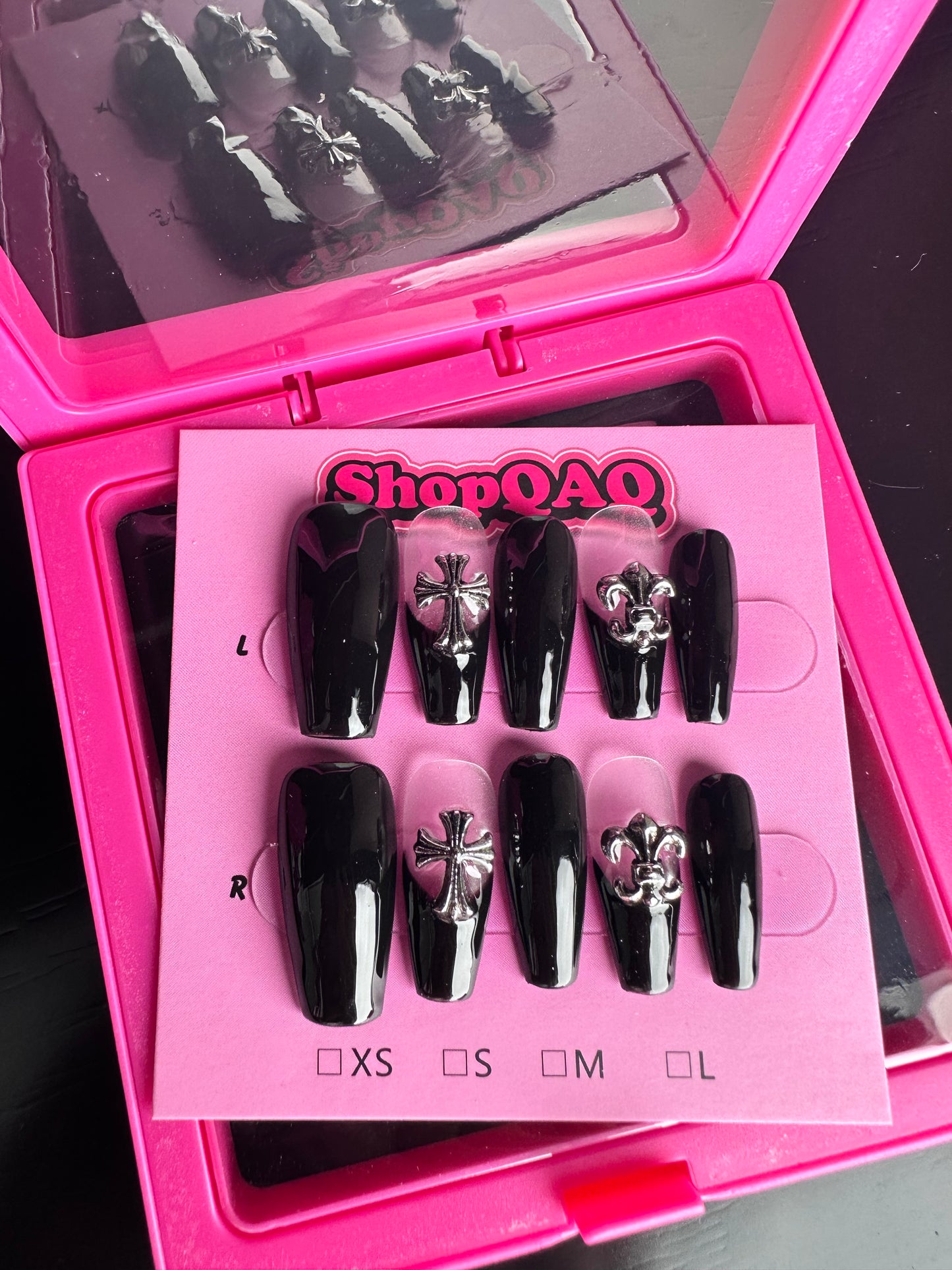 Embrace a bold and edgy look with our handcrafted Gothic-style press on nails, featuring the iconic Chrome Hearts cross design. These nails are meticulously crafted to capture the essence of Gothic fashion, blending dark aesthetics with a touch of elegance. Each set includes a variety of sizes to ensure a perfect fit and comes with easy-to-apply adhesive tabs, offering a secure and comfortable wear.