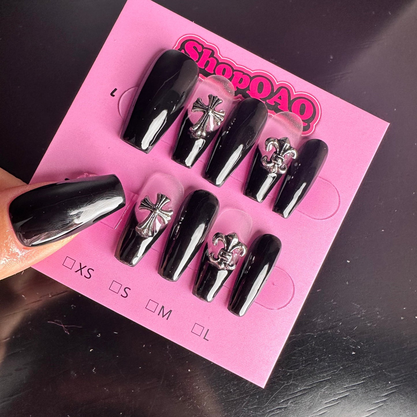 Gothic Chrome Hearts Cross Press On Nails – Handmade & Reusable