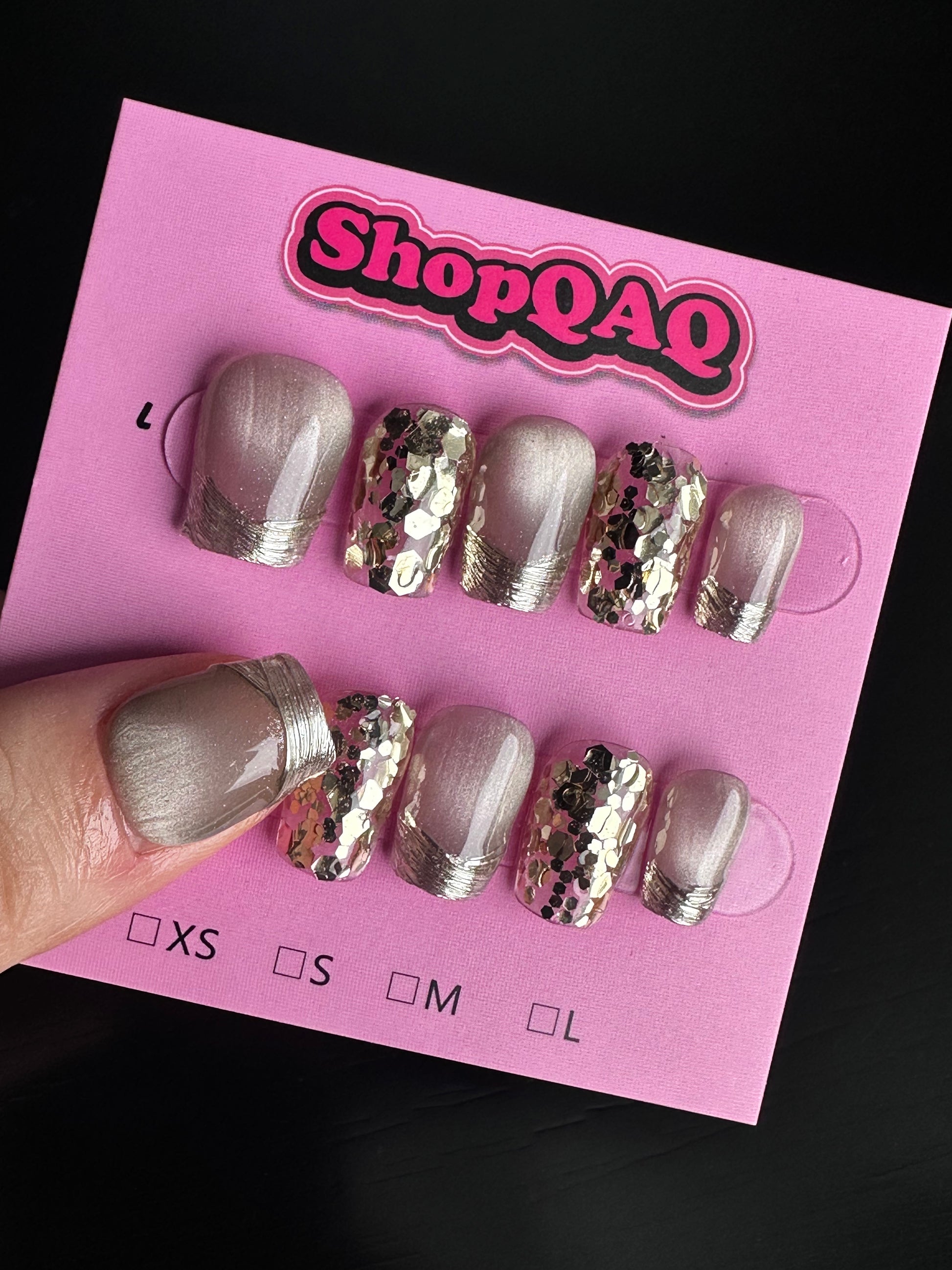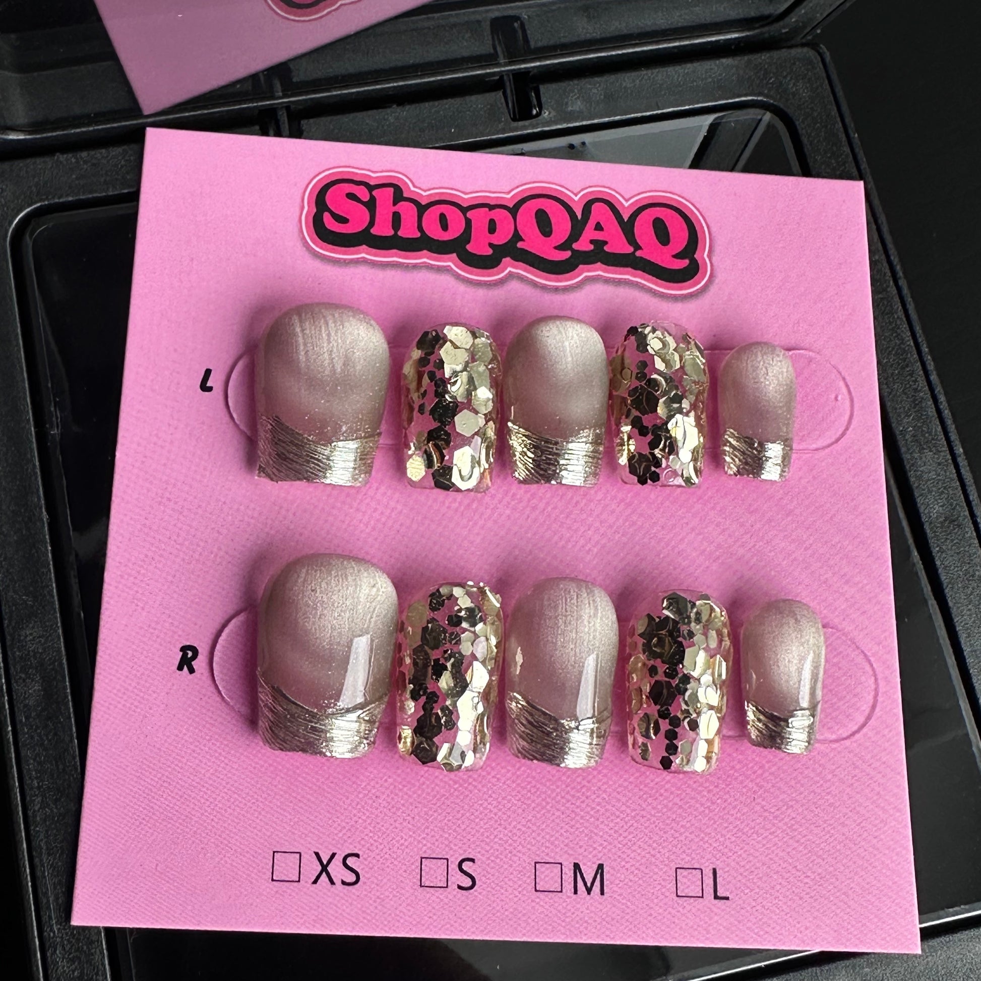 #ShopQAQ #HandcraftedNails #CatEyeNails #SparklingNails #FrenchGoldEdge #NewYearNails #ElegantNails #ReusableNails #StarryNightNails